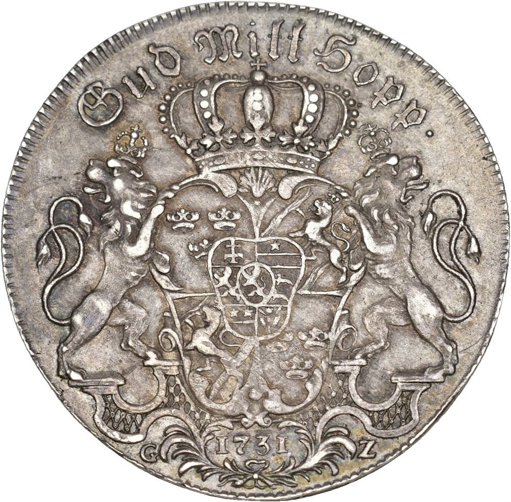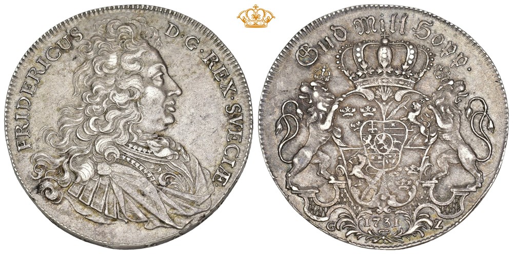 Riksdaler 1731, Stockholm. 29,13 g. Variant uten kroner i mantelen.
