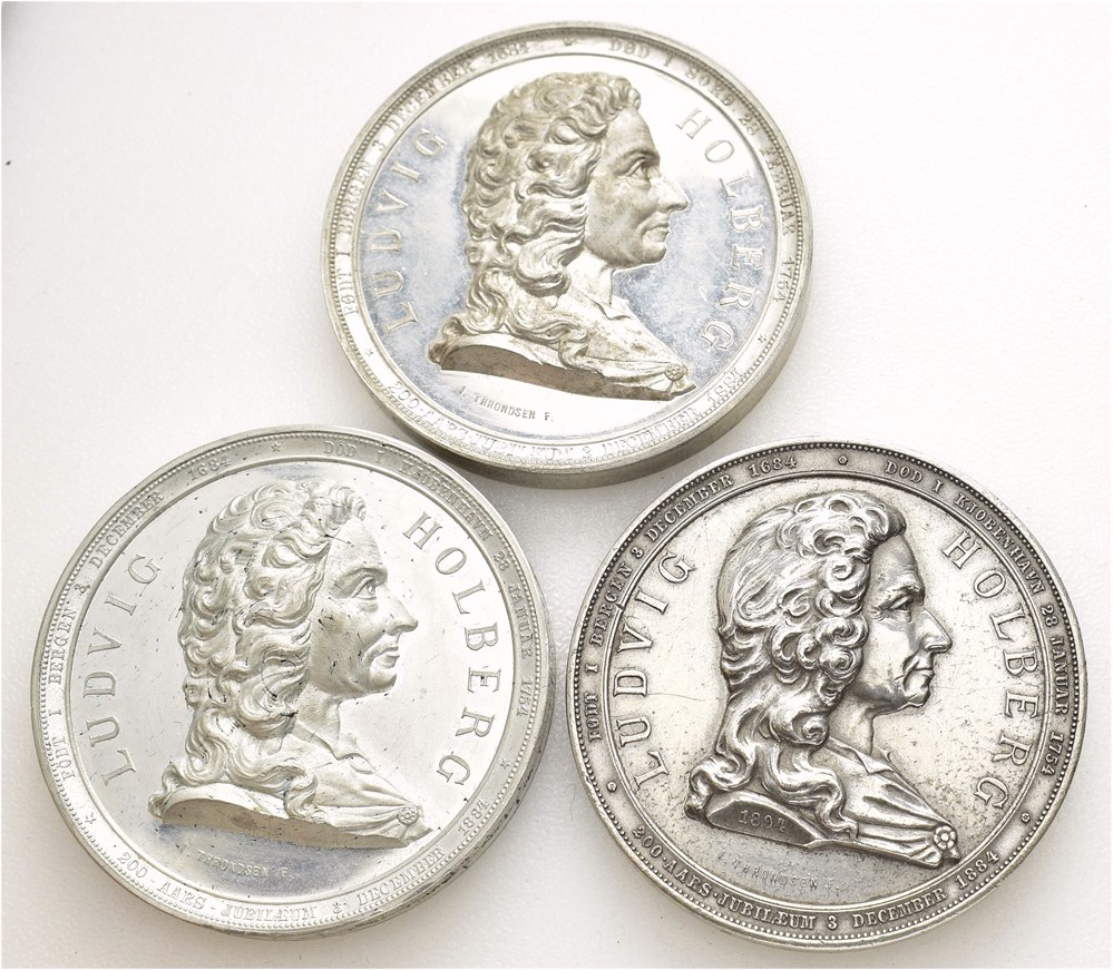 Ludvig Holberg (1684-1754). Throndsen. Lott 3 medaljer i tinn (1884, 1894 og 1934 i orig. eske). 50 mm