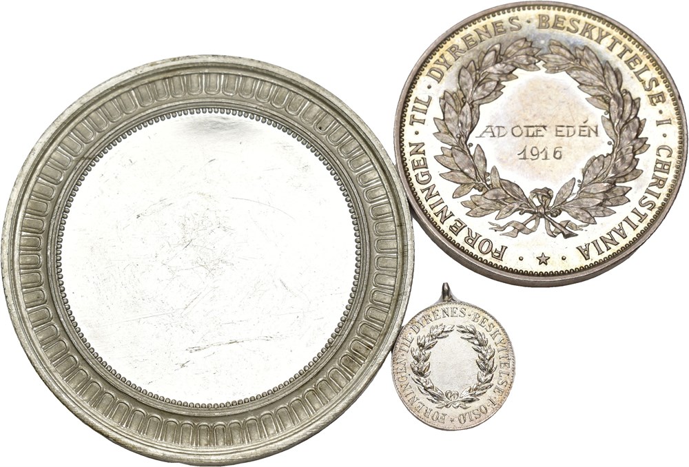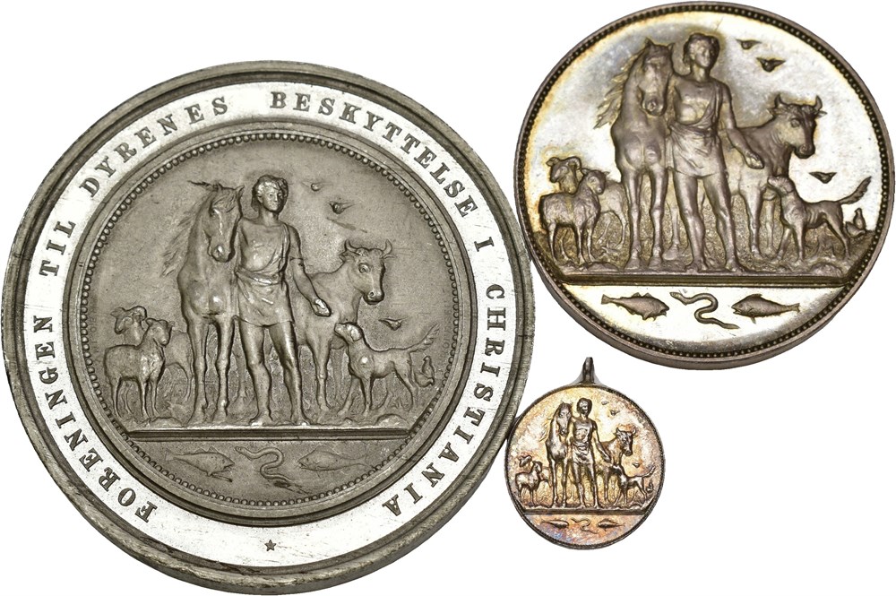 Foreningen til Dyrenes beskyttelse i Christiania 1886. Throndsen. Lott 3 medaljer: Tinn 50 mm, sølv 36 mm og 15 mm m/h