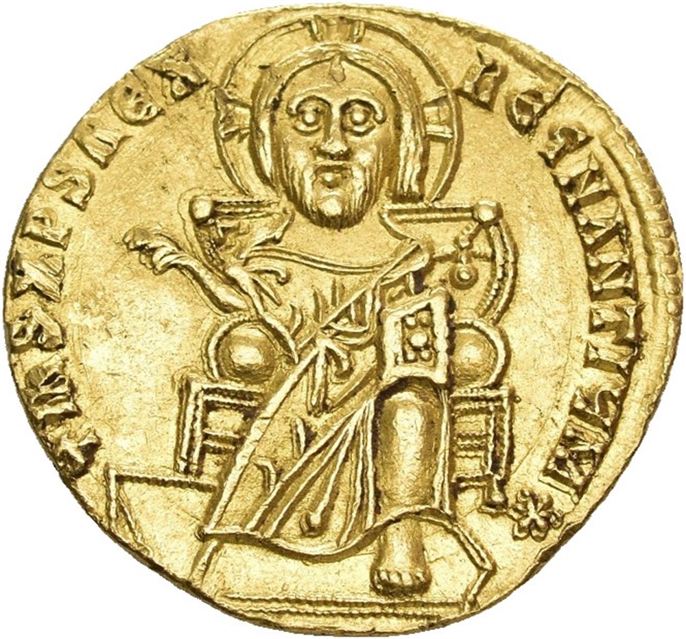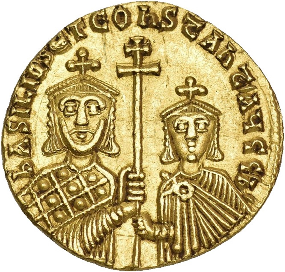 Basil I the Macedonian with Constantine 867-886 AD. AV Solidus (20 mm; 4.38 g). Constantinople mint, struck circa 868-879 AD. Obverse: +IhS XPS RЄX RЄGNANTIЧM *, Christ Pantokrator, nimbate, enthroned facing on suppedion, raising right hand in benediction and holding Gospels in left. Reverse: bASILIOS ЄT COhSTAhT AЧςς b, Crowned facing busts of Basil I, wearing loros, and Constantine wearing chlamys, holding in between them a long patriarchal cross. Crisp details.