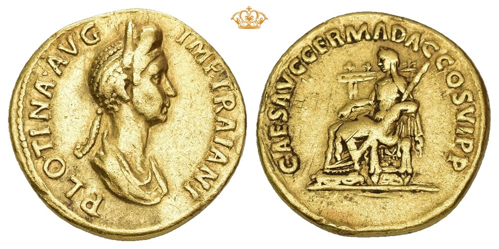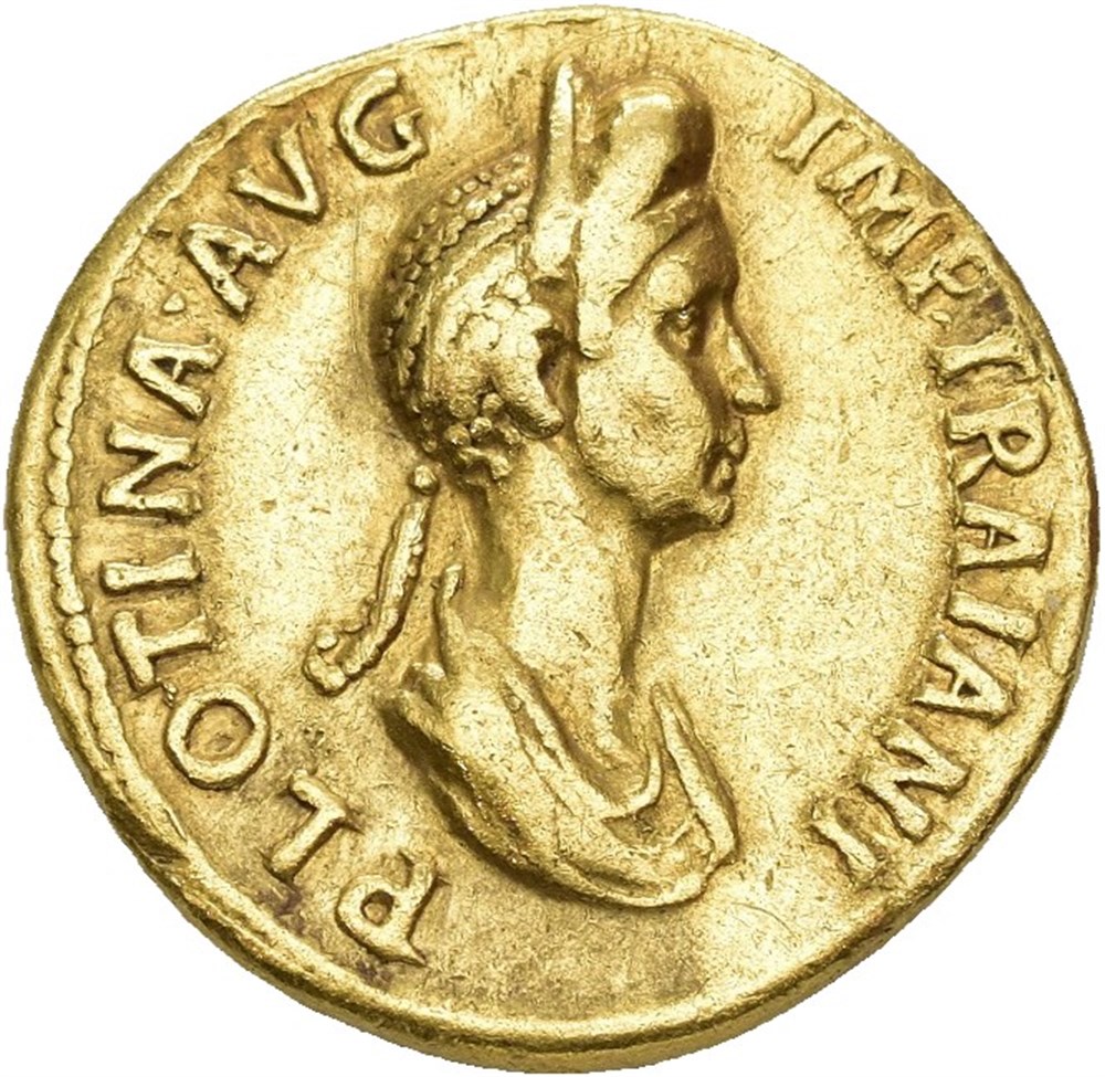 Plotina, Augusta 105-123 AD. AV Aureus (19 mm; 7.27 g). Rome mint. Struck under Trajan, circa AD 112-114 AD. Obverse: PLOTINA AVG IMP TRAIANI, Draped bust of Plotina right, wearing stephane. Reverse: CAES AVG GERMA DAC COS VI P P, Vesta enthroned left, holding long scepter in left arm. Small graffiti on reverse. Extremely rare.
