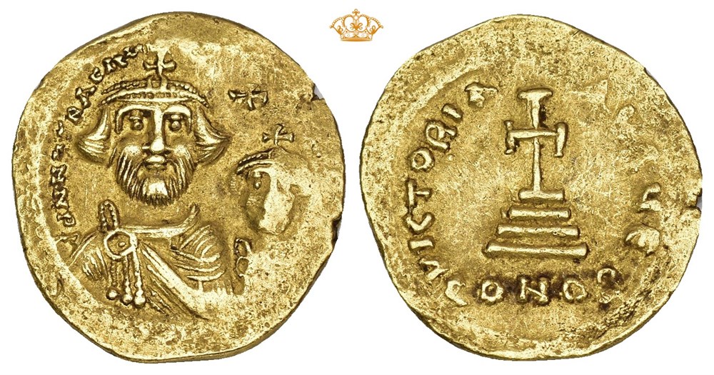 Heraclius, with Heraclius Constantine, 610-641 AD. AV Solidus (20 mm; 4.48 g). Constantinople mint, struck circa 616-625 AD. Obverse: dd NN ҺЄRACL(IЧS ЄT ҺЄRA CONST P P AV), Crowned busts of Heraclius and Heraclius Constantine facing, both wearing chlamys; cross above. Reverse: VICTORIA AVGЧ Є - CONOB, Cross potent on base and three steps. Areas of weak strike and minor roughness in fields.