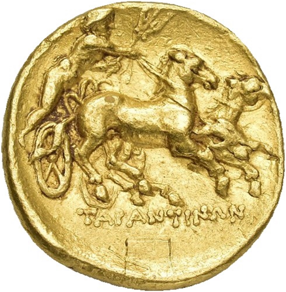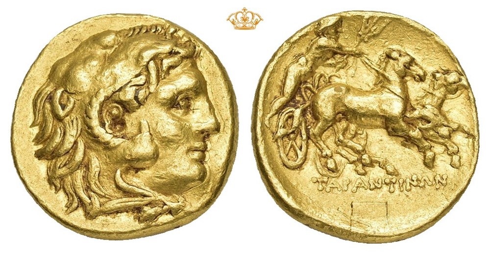 CALABRIA, Tarentum. Pyrrhos of Epeiros 319/8-272 BC. AV Hemistater (15 mm; 4.31 g). Struck circa 276-272 BC. Obverse: Head of Heracles right, wearing lion skin headdress. Reverse: TAPANTINΩN, Male youth riding biga right, holding reins in right hand and trident in left. Minor scratches reverse field, otherwise, well struck and attractive.