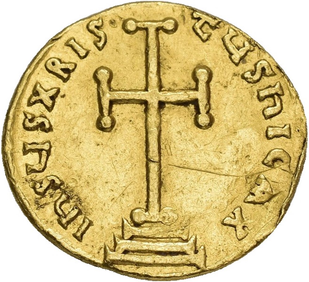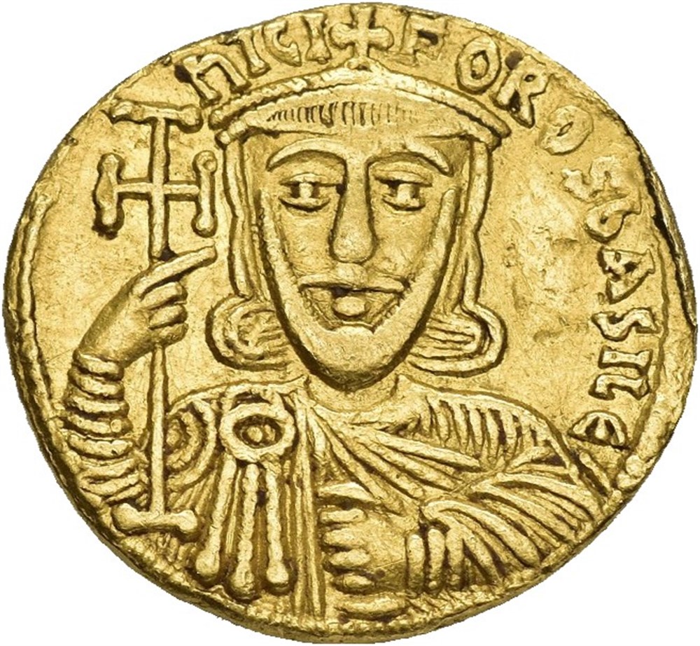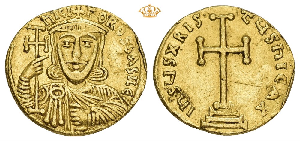 Nicephorus I 802-811 AD. AV Solidus (19 mm; 4.42 g). Constantinople mint, struck circa 802-803 AD. Obverse: hICI FOROS bASILЄ, Crowned bust of Nicephorus I facing, wearing chlamys, holding cross in right hand and akakia in left. Reverse: IhSЧS XRIStЧS nICA X, Cross potent on base and three steps. Traces of tooling in fields and minor scratches. Scarce.