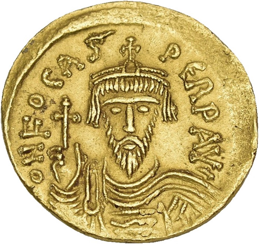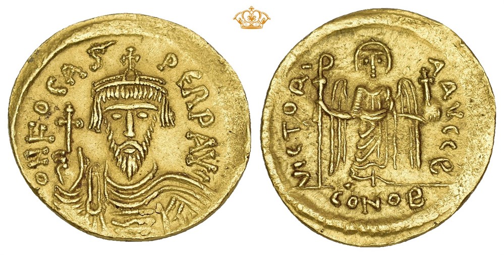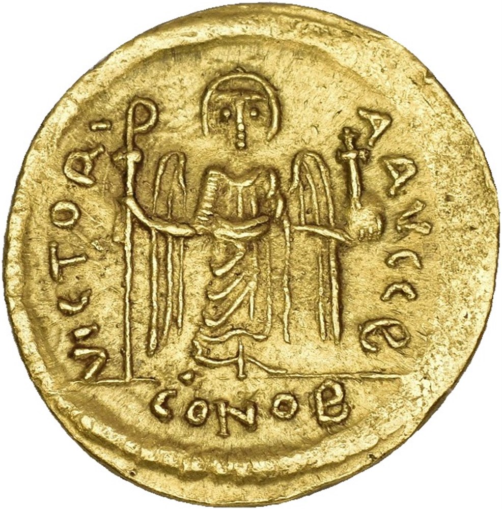 Phocas 602-610 AD. AV Solidus (21 mm; 4.46 g). Constantinople mint, struck circa 603-607 AD. Obverse: o N FOCAS PЄRP AVI, Crowned, draped and cuirassed bust of Phocas facing, holding globus cruciger in right hand. Reverse: VICTORIA AVGG B - CONOB, Angel standing facing, holding staff surmounted by staurogram in right hand and globus cruciger in left. Well struck and attractive.