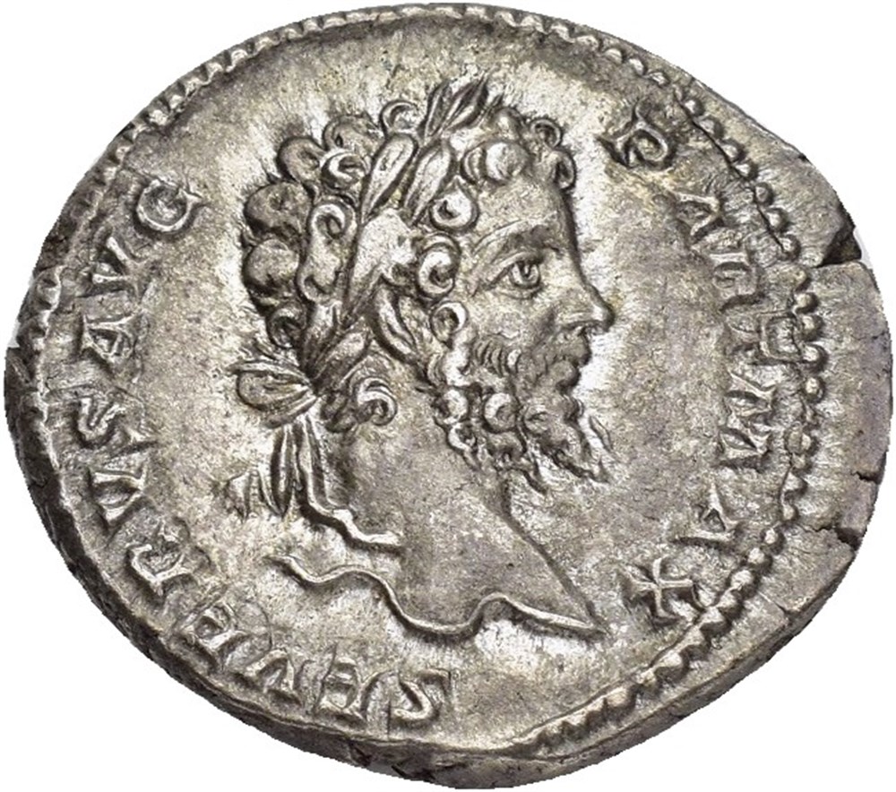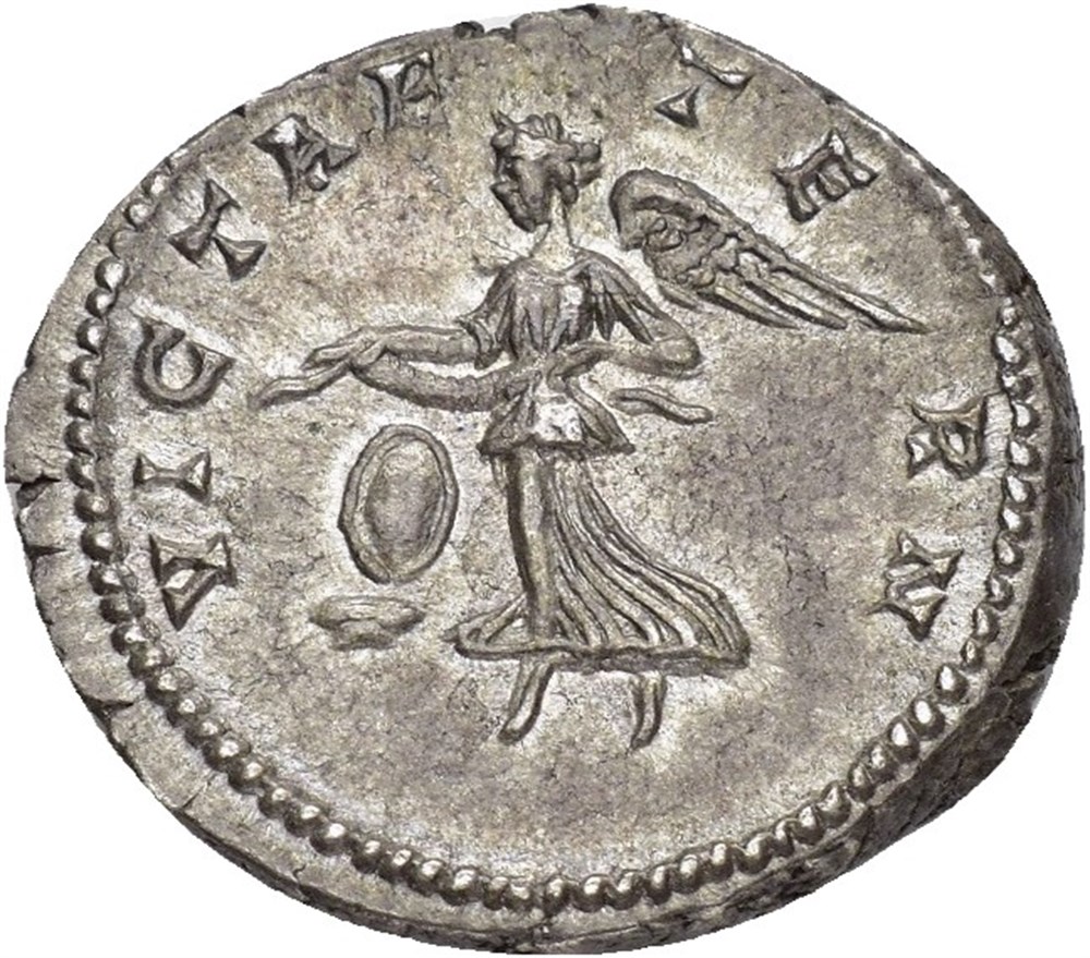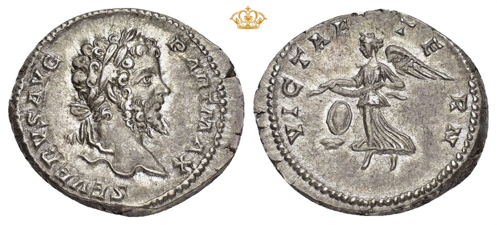 Septimius Severus 193-211 AD. AR Denarius (20 mm; 3.33 g). Rome mint, struck 200-201 AD. Obverse: SEVERVS AVG PART MAX, Laureate head of Septimius Severus right. Reverse: VICT AETERN, Victory flying left, holding wreath above shield set on low base. Sharply struck and attractively toned.