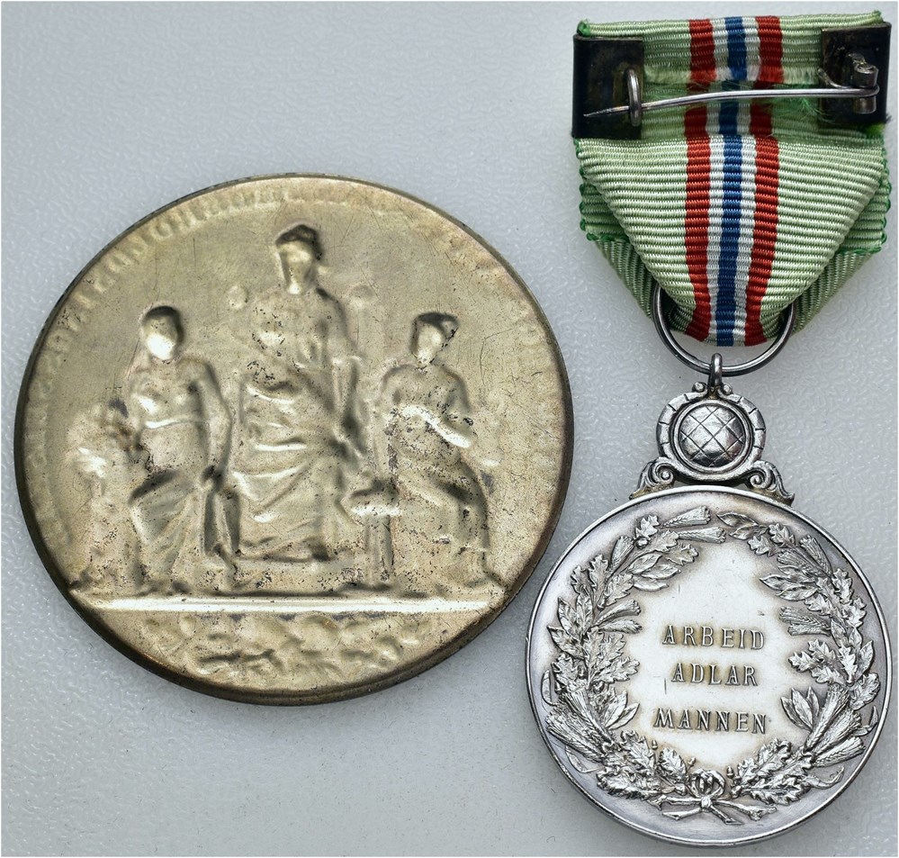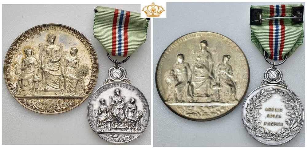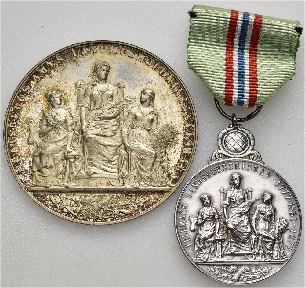 Telemark Landbruksselskap. Sølv m/h og bånd 31 mm. Renset. I originalt etui og Bratsberg Amts Landhusholdningsselskab. Sølvblikk 50 mm