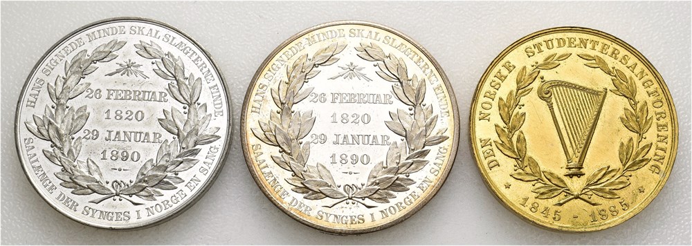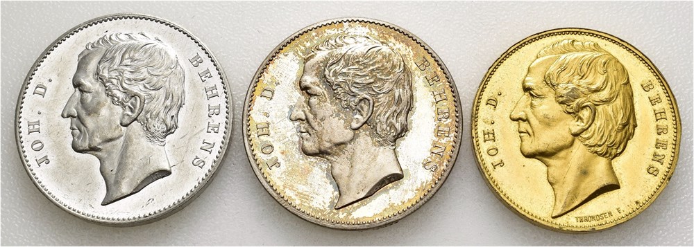 Joh. D. Behrens 1820-1890. Tinn 35 mm, restrike i sølv 35 mm og Den Norske Studentersangforening 1845-1885 i forgylt bronse 34 mm. Lott 3 medaljer.
