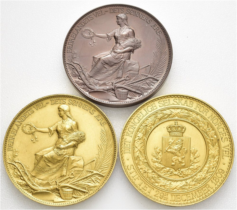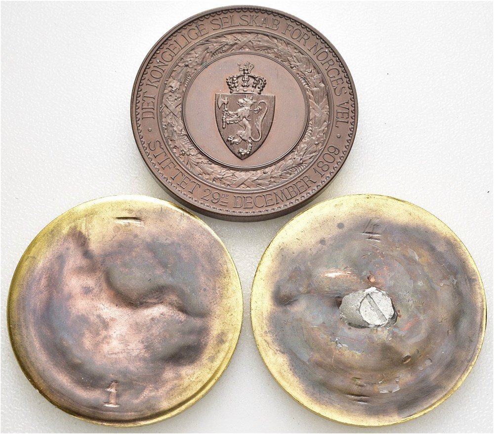 Det Kongelige Selskab For Norges Vel. Stiftet 1809. Throndsen. Lott 3 medaljer: Bronse i orig. etui og to ensidige avslag i forgylt bronse. Utgave etter 1905.