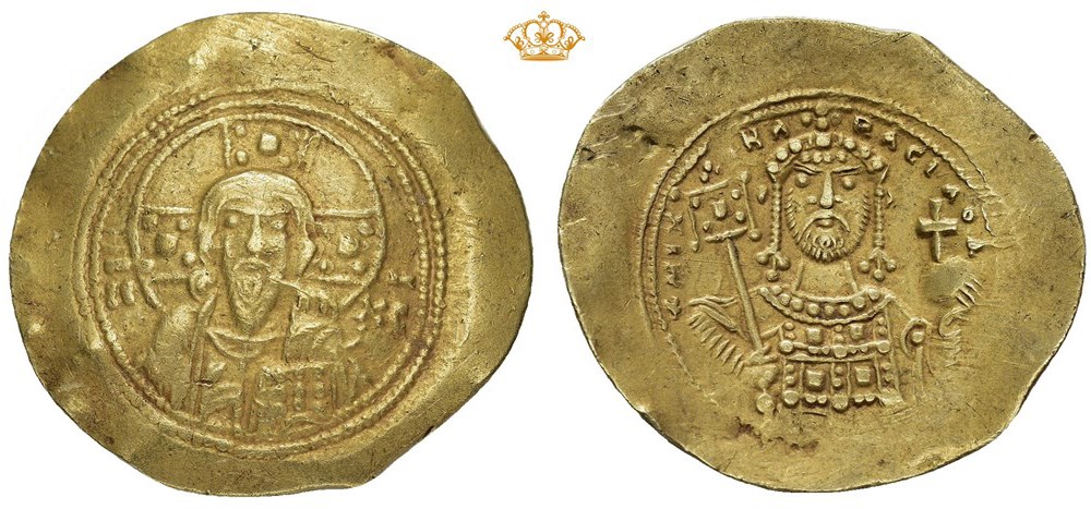 Michael VII 1071-1078. EL Histamenon Nomisma (28 mm; 4.34 g), Constantinople mint. IC XC, Facing bust of Christ Pantokrator, raising right hand in benediction and holding Gospels with left. / +MIXAHΛ RACIA OΔ, Crowned facing bust of Michael VII, wearing loros, holding labarum and globus cruciger. A few marks in fields.