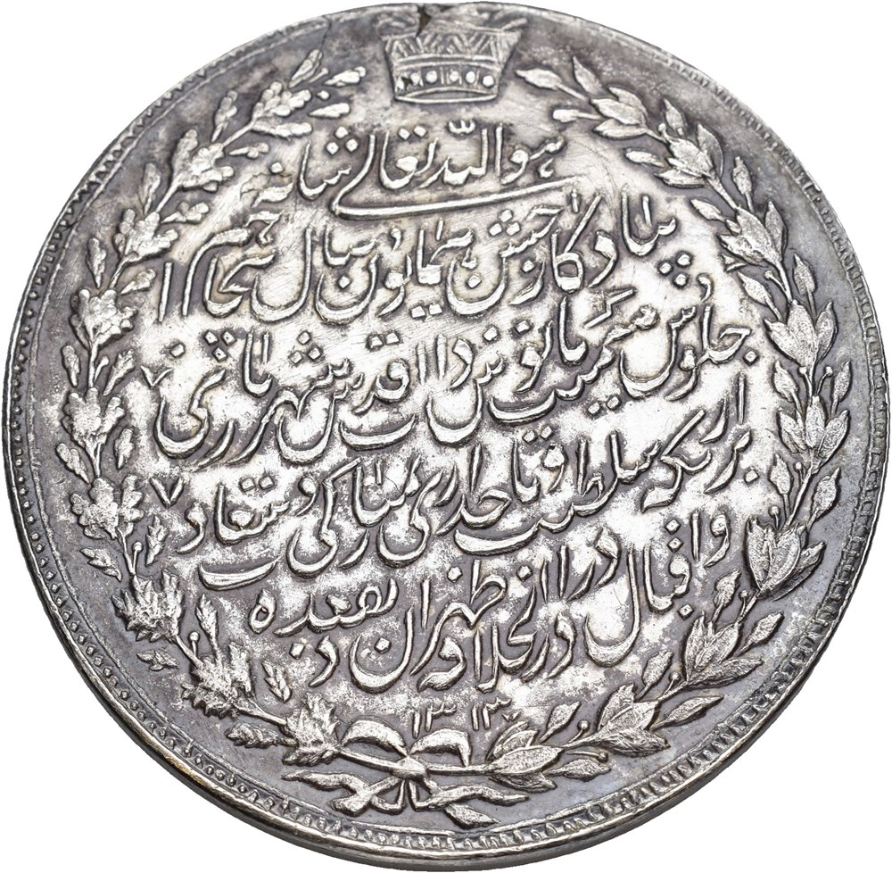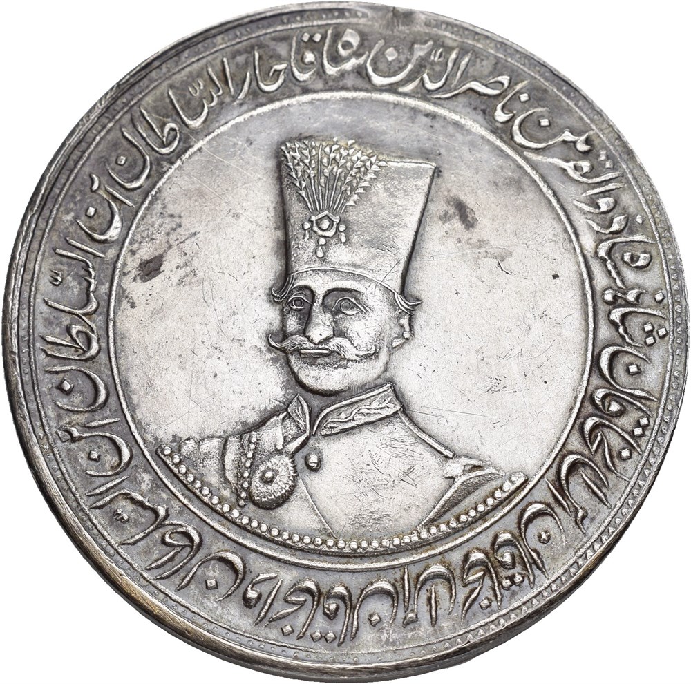 10 Kran AH1313 1895/6, Tehran. 45.98 g. Commemorative issue struck for the 50th anniversary reign of Nasir al-Din Shah. Lightly cleaned, minor scratches, prev. mounted.