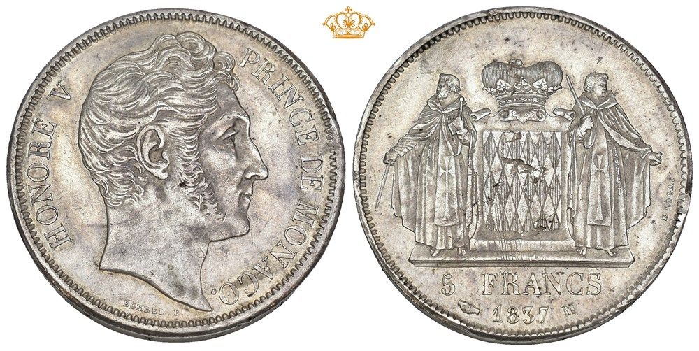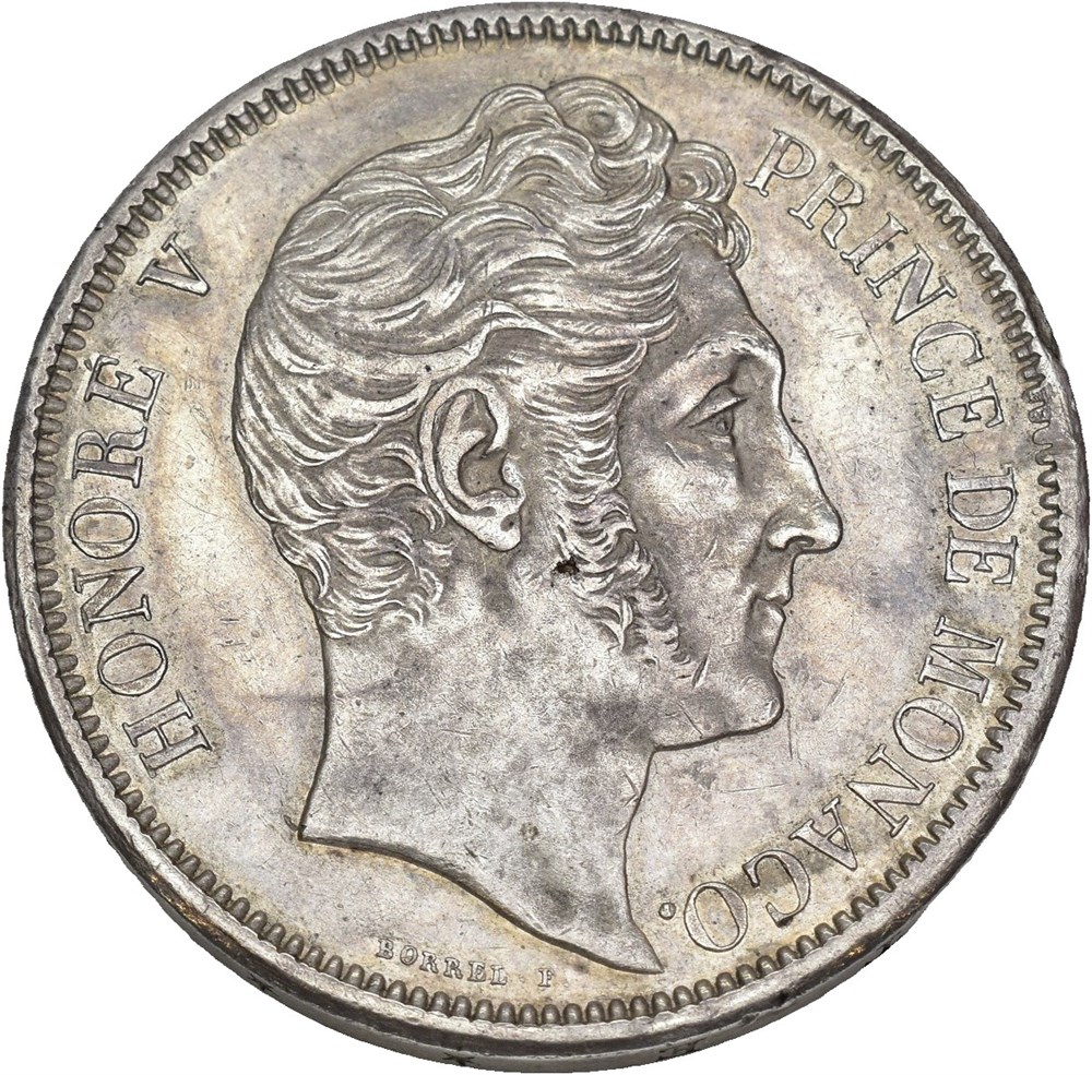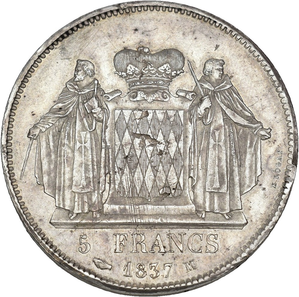 5 Francs 1837, Monaco. 24.99 g. Lightly cleaned, minor scratches reverse, edge nicks.