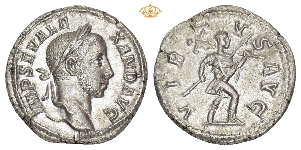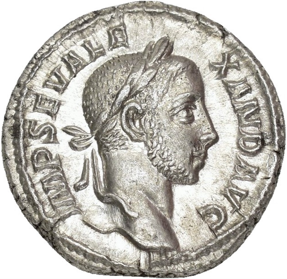 Severus Alexander 222-235 AD. AR Denarius (20 mm; 3.31 g). Rome mint, struck 228-231 AD. Obverse: IMP SEV ALEXAND AVG, Laureate head of Severus Alexander right. Reverse: VIRTVS AVG, Severus Alexander advancing right, holding spear in right hand and trophy over left shoulder. Bold portrait. Lustrous and lightly toned.