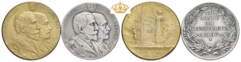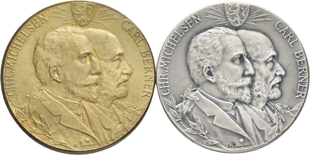 Chr. Michelsen og Carl Berner. Throndsen. Lott 2 medaljer: Forgylt bronse og restrike i sølv 27 mm