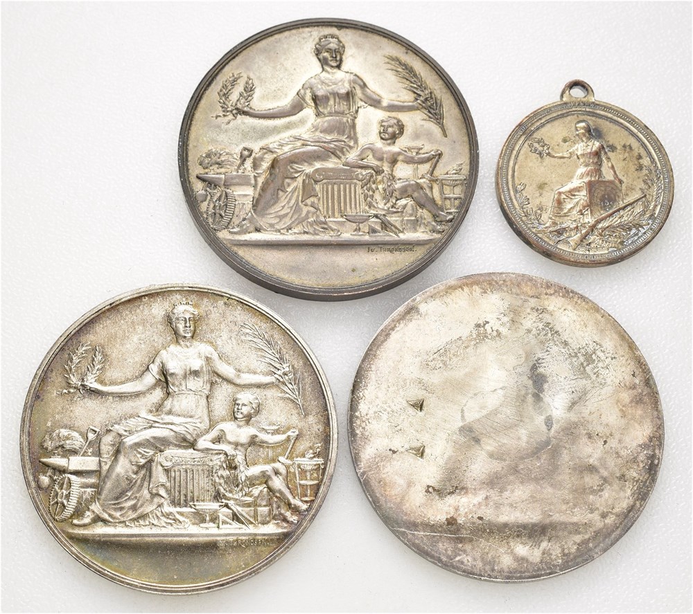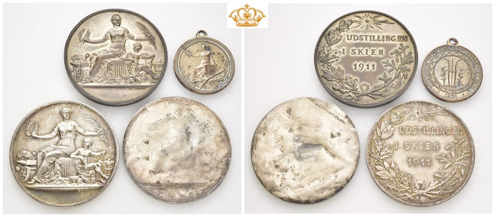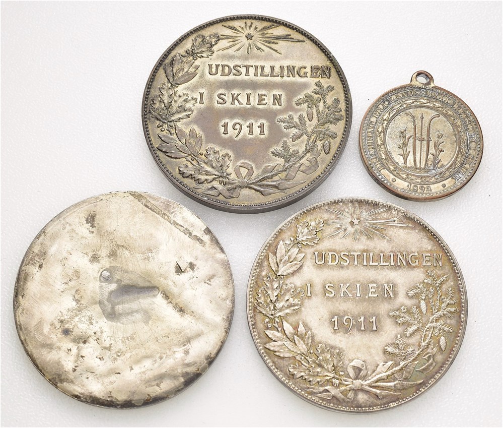 Udstillingen i Skien 1911. Throndsen. Forsølvet bronse, to ensidige avslag i forsølvet bronse og Erindring fra Landsskytterfesten i Skien 1894. Forsølvet bronse 27 mm.