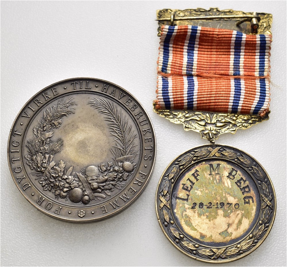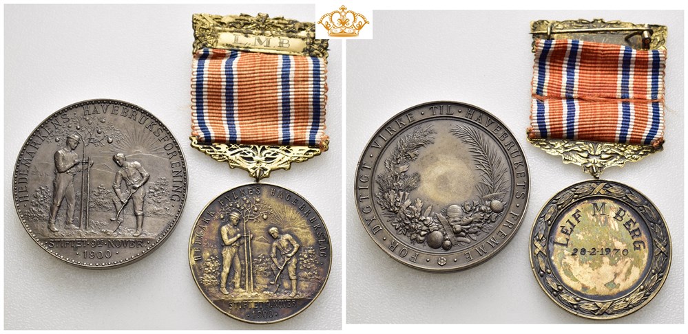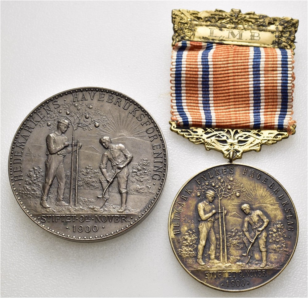 Hedemarkens Havebruksforening. To sammensatte ensidige avslag i forsølvet bronse 45 mm. Hedmark Fylkes Hagebrukslag. Forgylt bronse med bånd og agraff 35 mm i orig. etui