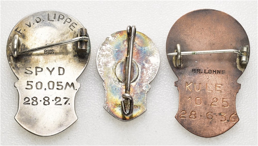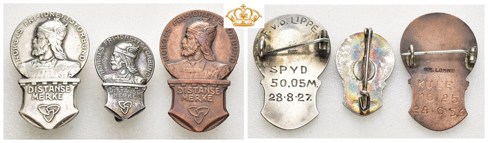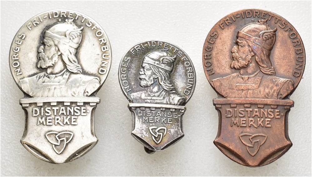 Norges Fri- Idrettsforbund. Distansemerke med nål. Lott 3 stk.: Sølv 18x25 mm, sølv 24x37 mm og bronse 24x37 mm