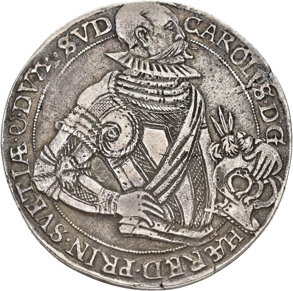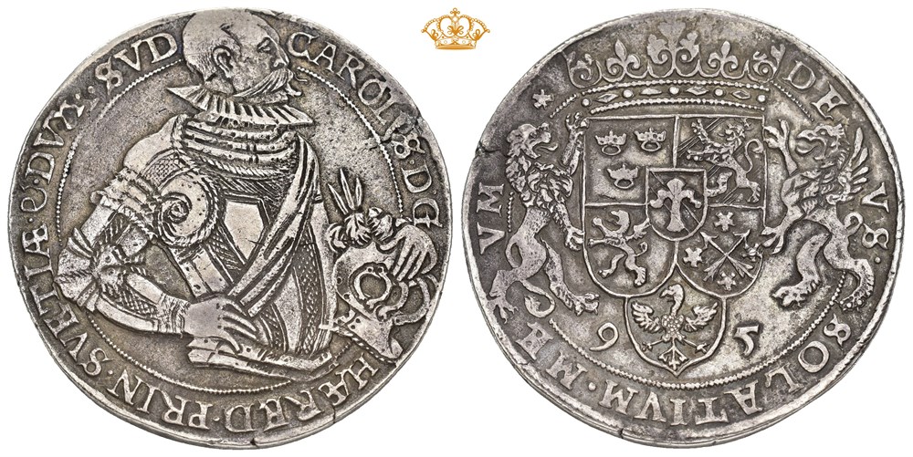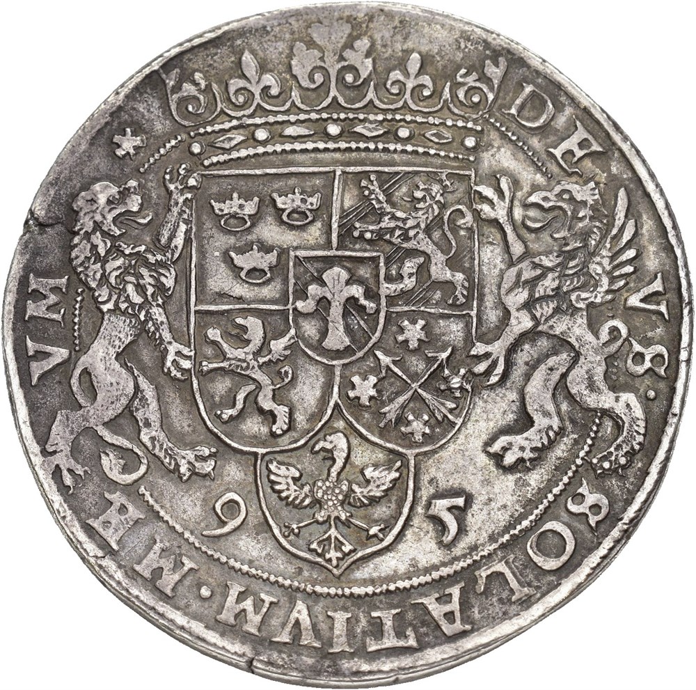 Daler 1595, Stockholm. 28,15 g. Liten blankettfeil, noe korrodert. Meget sjelden.