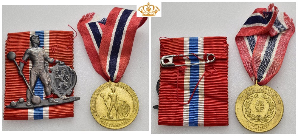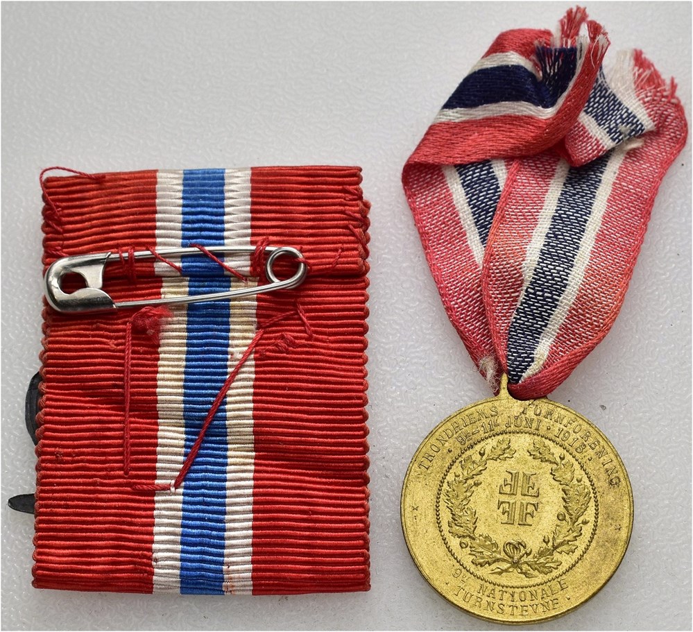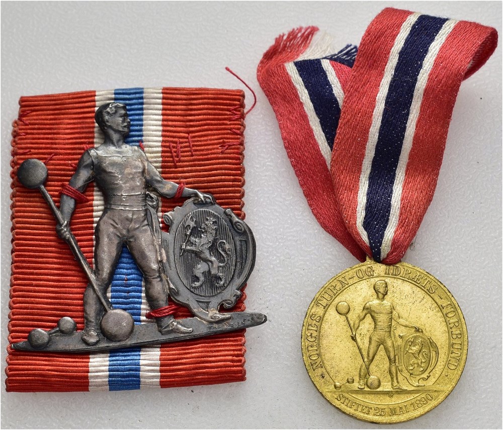 Det Norske Turn- og Gymnastikkforbund. Ensidig merke 37x36 mm i sølv og Trondhjems turnforening 1918. Forgylt bronse 24 mm m/h og bånd. Lott 2 medaljer