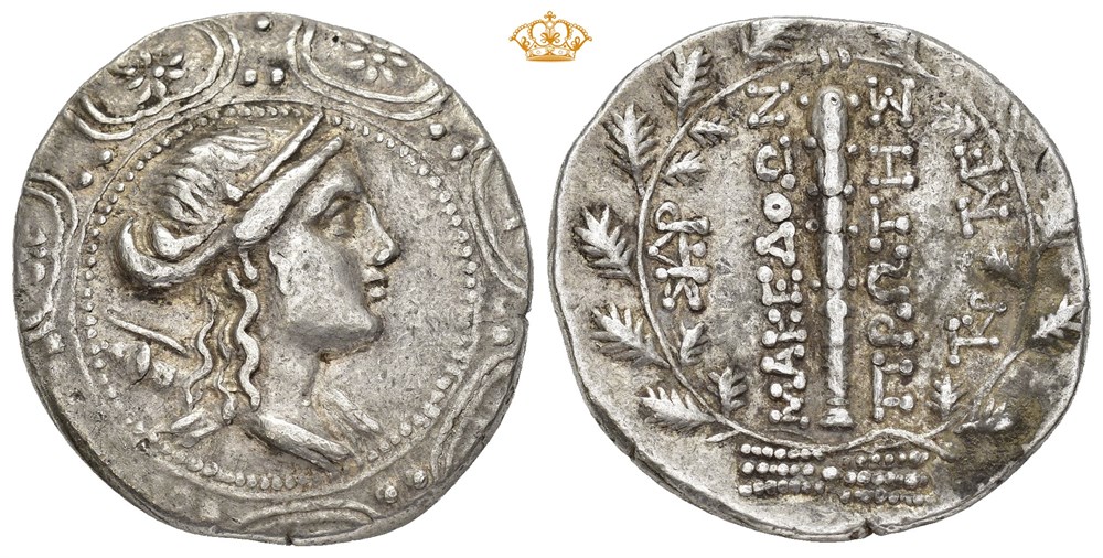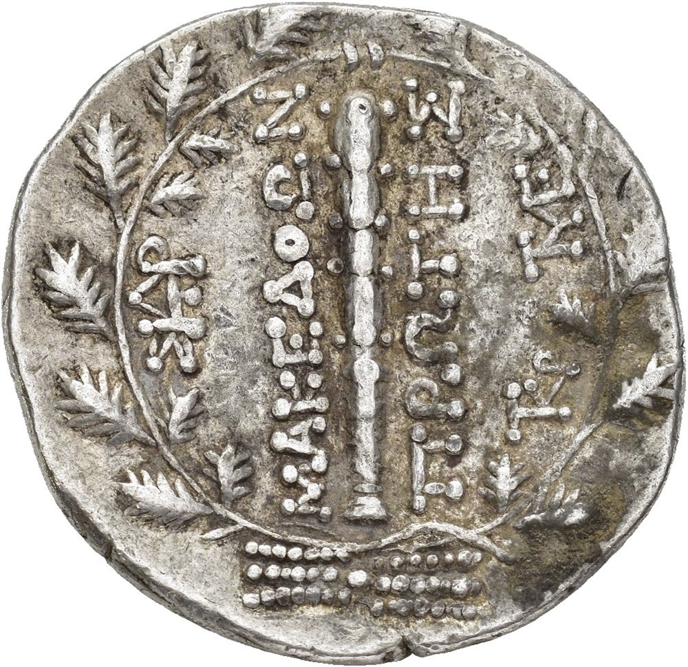 MACEDON, Republican Period. First Meris, circa 167-149 BC. AR Tetradrachm (30 mm; 16.93 g). Amphipolis mint. Obverse: Diademed and draped bust of Artemis right, bow and quiver over shoulder and in the center of a Macedonian shield. Reverse: ΣΗΑYΡ MAKEΔONΩN ΠPΩTHΣ, Club to right; above, monogram; below, two monograms; all within oak wreath with ties; to left of the ties, thunderbolt. Traces of earthen deposits on reverse. Lightly toned.