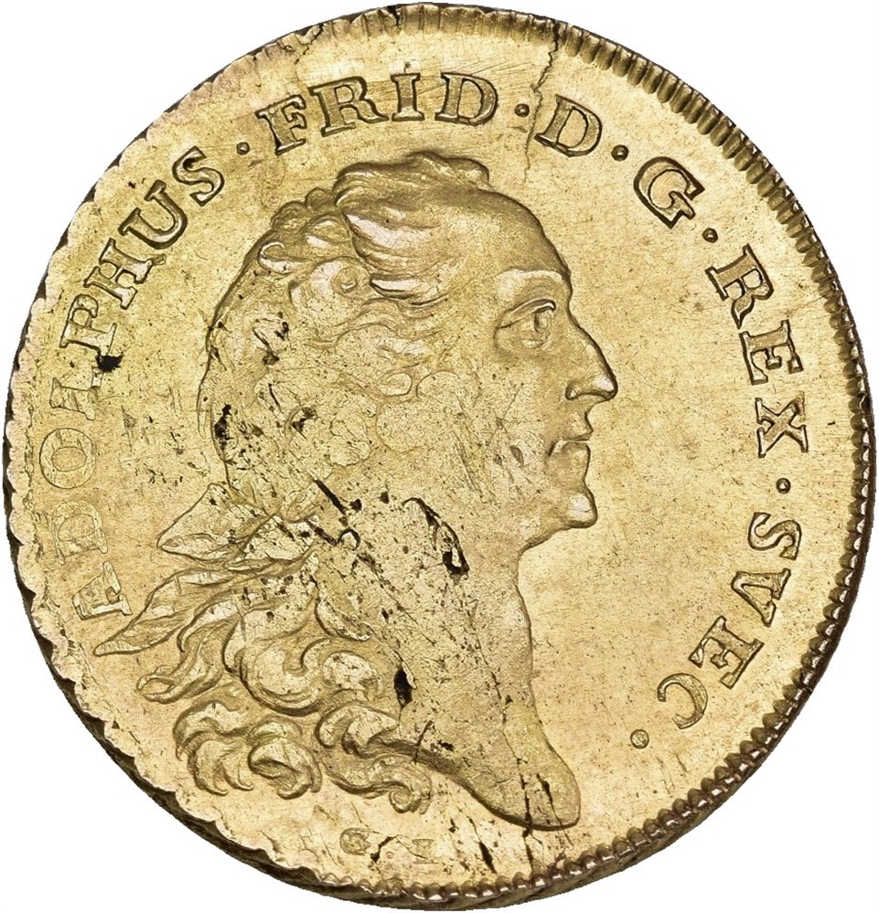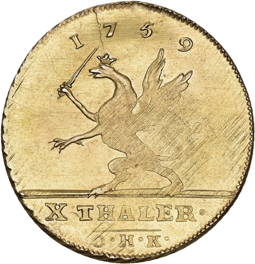 10 taler 1759, Stralsund. 13,36 g. Justeringsmerker, små blankettfeil.