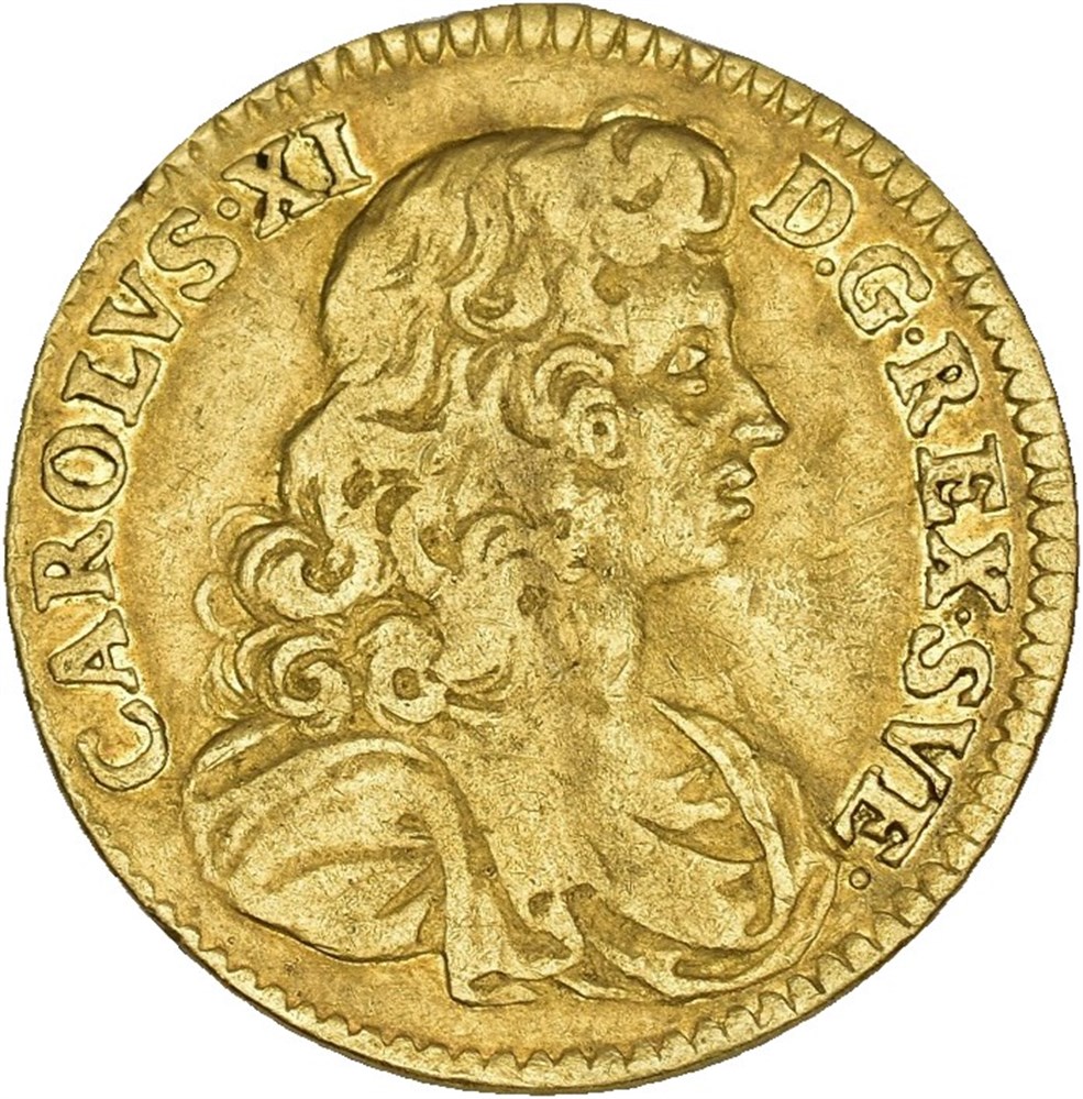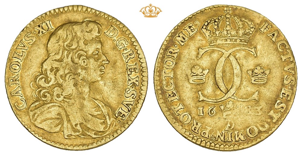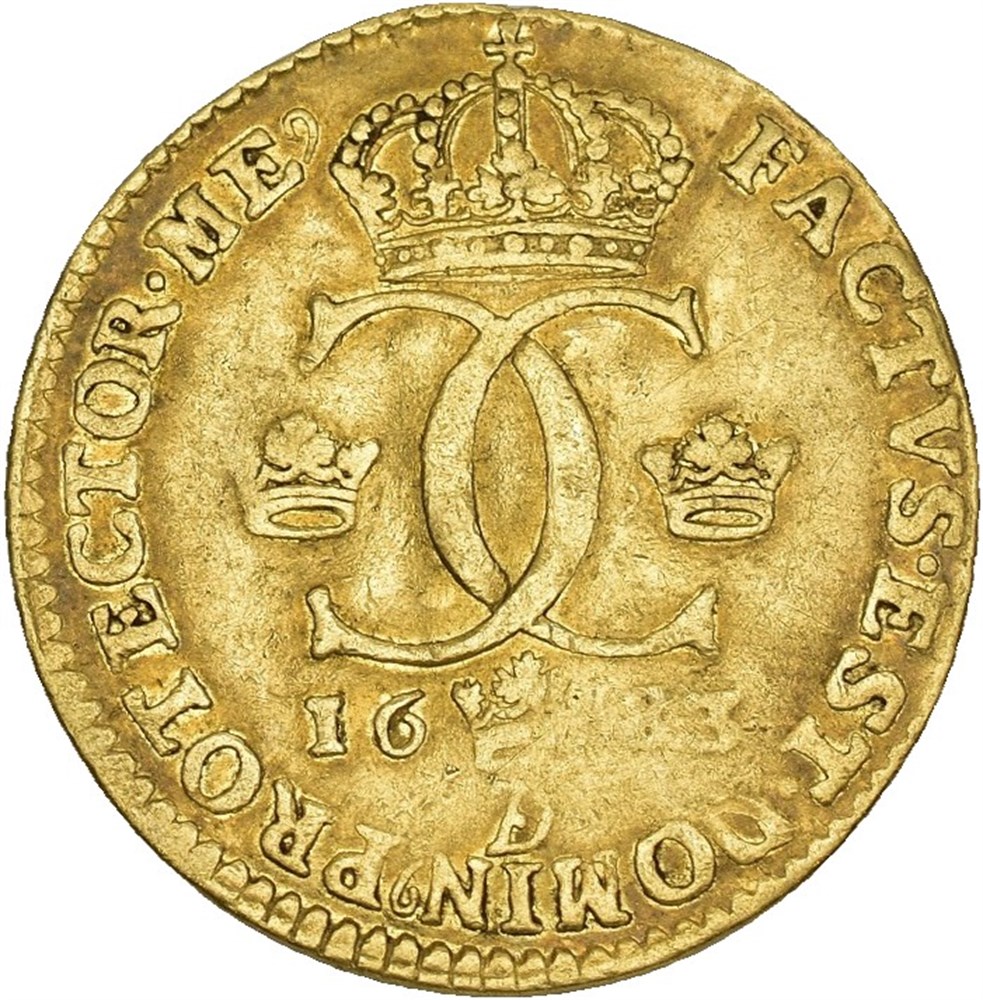Dukat 1683, Stockholm. 3,40 g. Buklet, kontaktmerker. Sjelden.