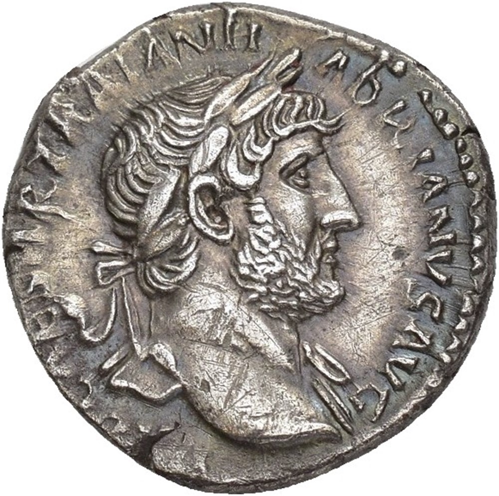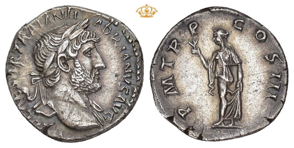 Hadrian 117-138 AD. AR Denarius (18 mm; 2.74 g). Rome mint, struck 121-123 AD. Obverse: IMP CAESAR TRAIAN HADRIANVS AVG, Laureate bust of Hadrian right, with slight drapery on left shoulder. Reverse: P M TR P COS III, Spes standing left, holding flower with right hand and lifting up hem of skirt with her left. A few hairlines in fields. Wonderfully toned.