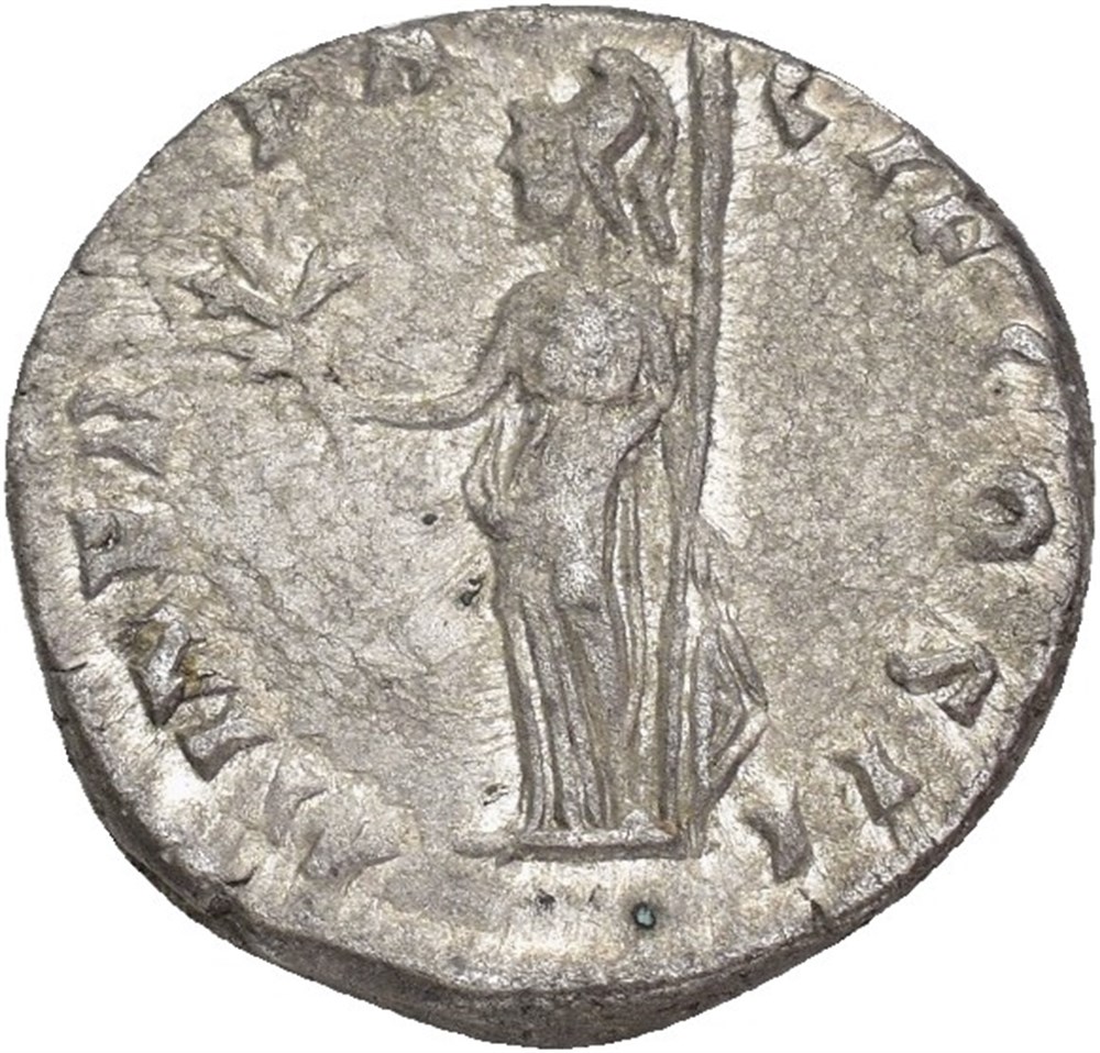 Clodius Albinus 193-195 AD. AR Denarius (18 mm; 3.74 g). Rome mint, struck 194-195 AD. Obverse: D CLOD SEPT ALBIN CAES, Bare head of Clodius Albinus right. Reverse: MINER PACIF COS II, Minerva standing left, holding olive branch in right hand and shield set on ground with left, spear resting in left arm. Struck with worn dies. Toned.