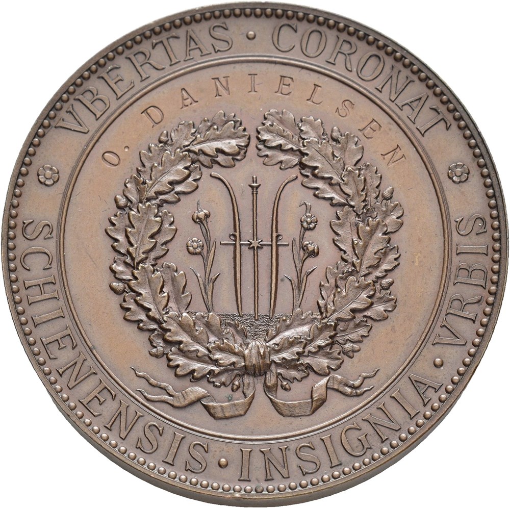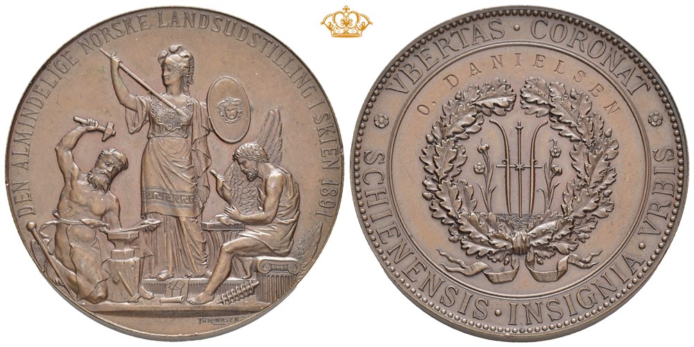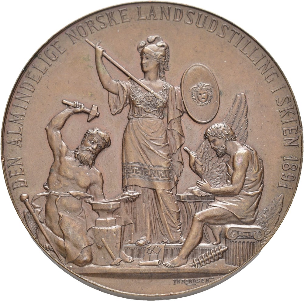 Den Almindelige Norske Landsutstilling i Skien 1891. Throndsen. Bronse 50 mm; 58,78 g. Inngravert "O. Danielsen" på revers