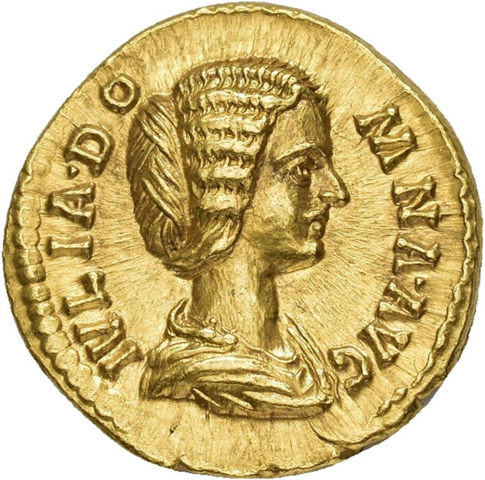 Julia Domna, Augusta 193-217 AD. AV Aureus (20 mm; 7.19 g). Rome mint, struck under Septimius Severus, circa 193-196 AD. Obverse: IVLIA DOMNA AVG, Draped bust of Julia Domna right. Reverse: VENERI VICTR, Venus standing with back turned, facing right, drapery falling below hips, resting left elbow on column; holding palm frond in left hand and apple with raised right hand. Almost as struck and highly lustrous.