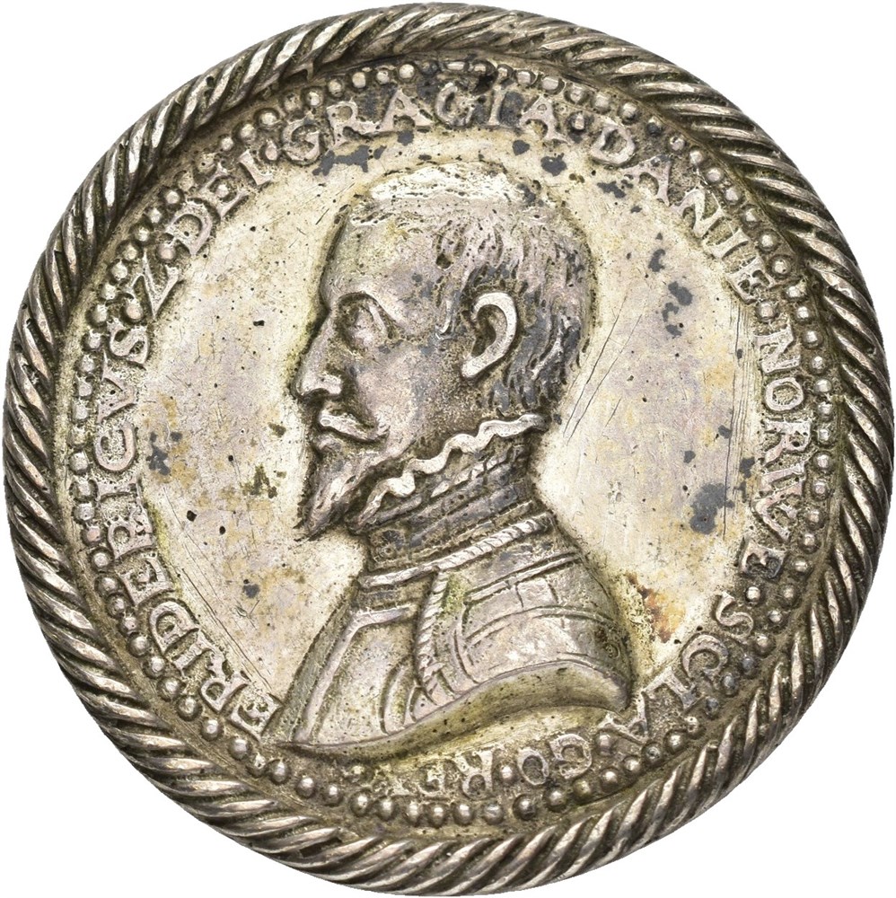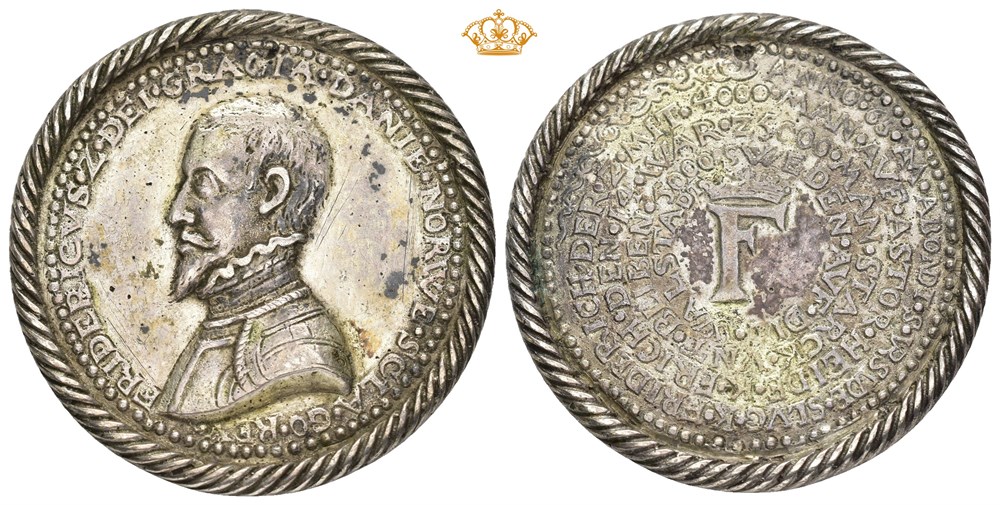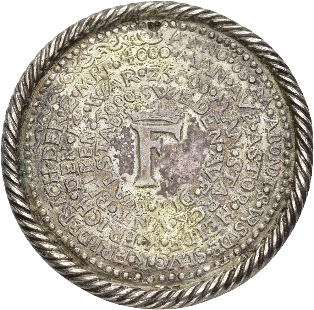 Seieren ved Axtorna 1565, D. Knop. Sølv 39 mm, 14.84 g. Opphøyet rillet rand. Oppgravert i feltene. Særdeles sjelden.
