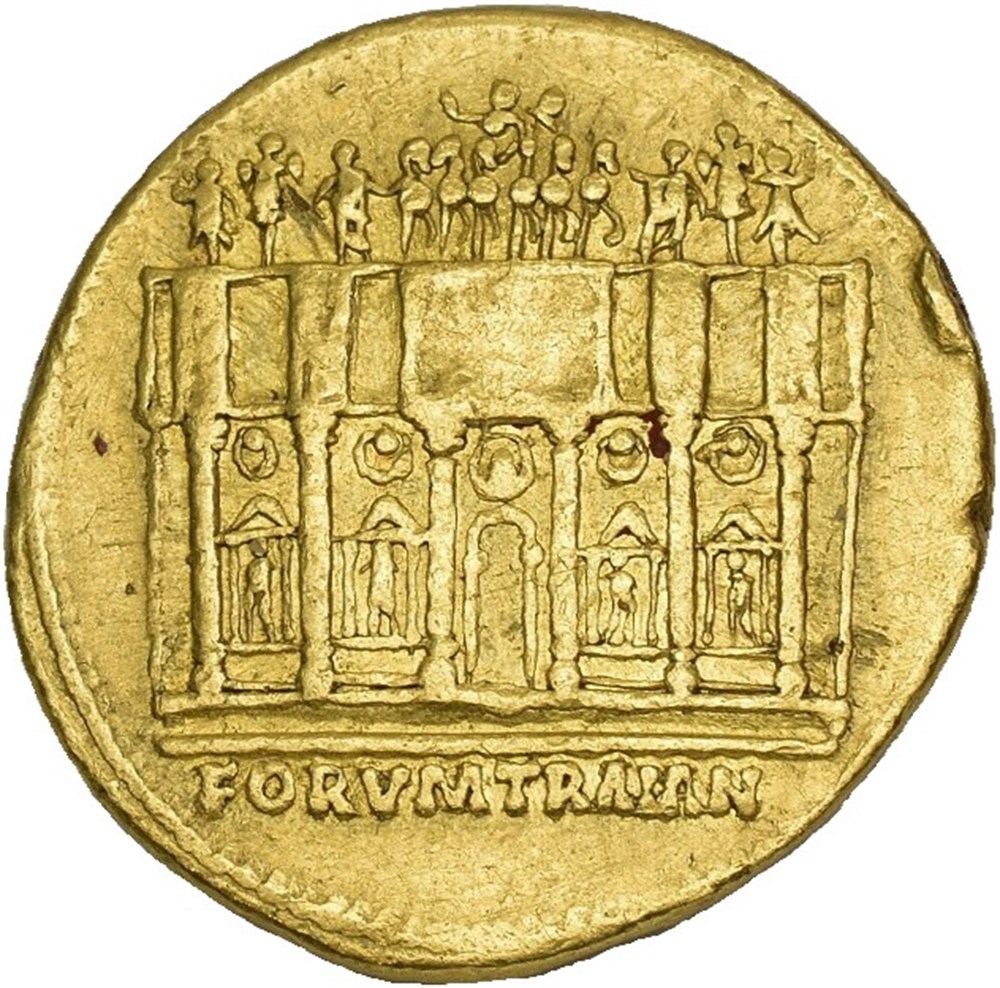 Trajan 98-117 AD. AV Aureus (20 mm; 7.29 g). Rome mint, struck circa 112-114 AD. Obverse: IMP TRAIANVS AVG GER DAC P M TR P COS VI P P, Laureate, draped and cuirassed bust of Trajan right. Reverse: FORVM TRAIAN, Frontal view of the facade of Trajan's forum, surmounted with a statue of a facing chariot with six horses and three statues on each side. Minor edge nicks.