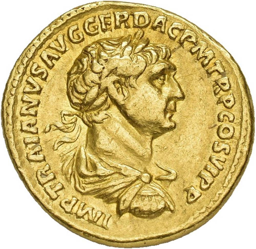 Trajan 98-117 AD. AV Aureus (20 mm; 7.29 g). Rome mint, struck circa 112-114 AD. Obverse: IMP TRAIANVS AVG GER DAC P M TR P COS VI P P, Laureate, draped and cuirassed bust of Trajan right. Reverse: FORVM TRAIAN, Frontal view of the facade of Trajan's forum, surmounted with a statue of a facing chariot with six horses and three statues on each side. Minor edge nicks.