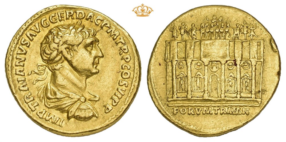 Trajan 98-117 AD. AV Aureus (20 mm; 7.29 g). Rome mint, struck circa 112-114 AD. Obverse: IMP TRAIANVS AVG GER DAC P M TR P COS VI P P, Laureate, draped and cuirassed bust of Trajan right. Reverse: FORVM TRAIAN, Frontal view of the facade of Trajan's forum, surmounted with a statue of a facing chariot with six horses and three statues on each side. Minor edge nicks.