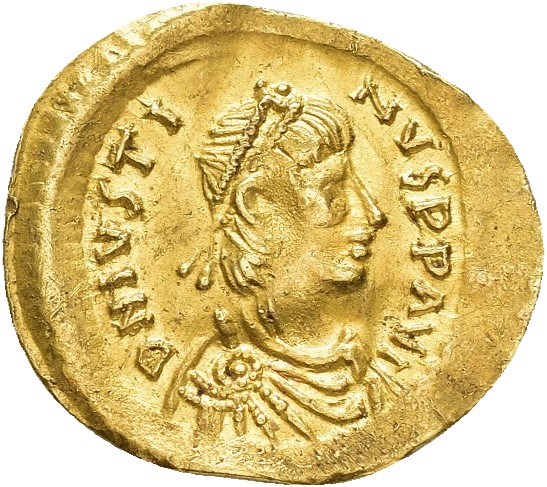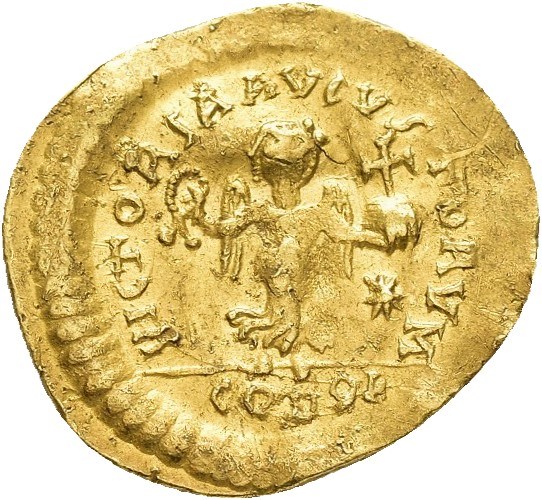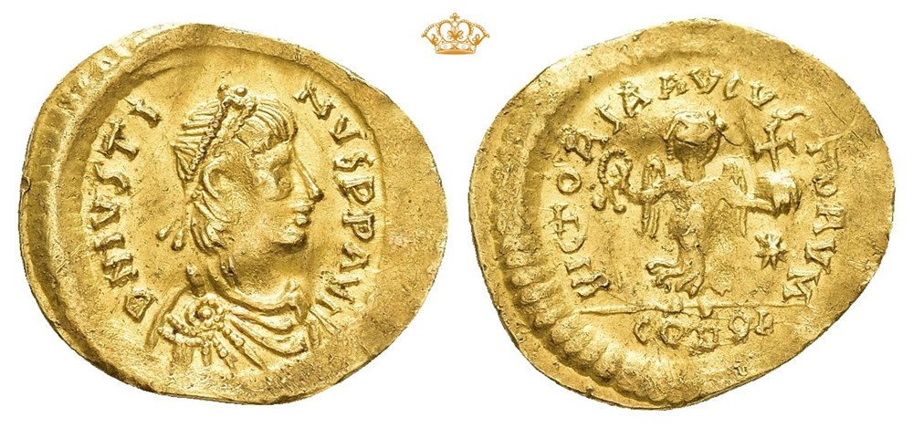 Justin II 565-578 AD. AV Tremissis (17 mm; 1.43 g). Constantinople mint. Obverse: D N IVSTI-NVS P P AVG, Diademed, draped and cuirassed bust of Justin II right. Reverse: VICTORIA AVGVSTORVI - CONOB, Victory advancing right, head turned left, holding wreath in her right hand and globus cruciger in left; in right field, star. Slightly wavy flan and faint graffiti.
