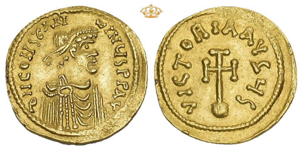 Constans II 641-668 AD. AV Semissis (18 mm; 2.24 g). Constantinople mint. Obverse: d N CONS-TAЧS PP AV, Diademed, draped and cuirassed bust of Constans II right. Reverse: VICTORIA AVΣЧS, Cross potent set on globe. Well struck and attractive for type.