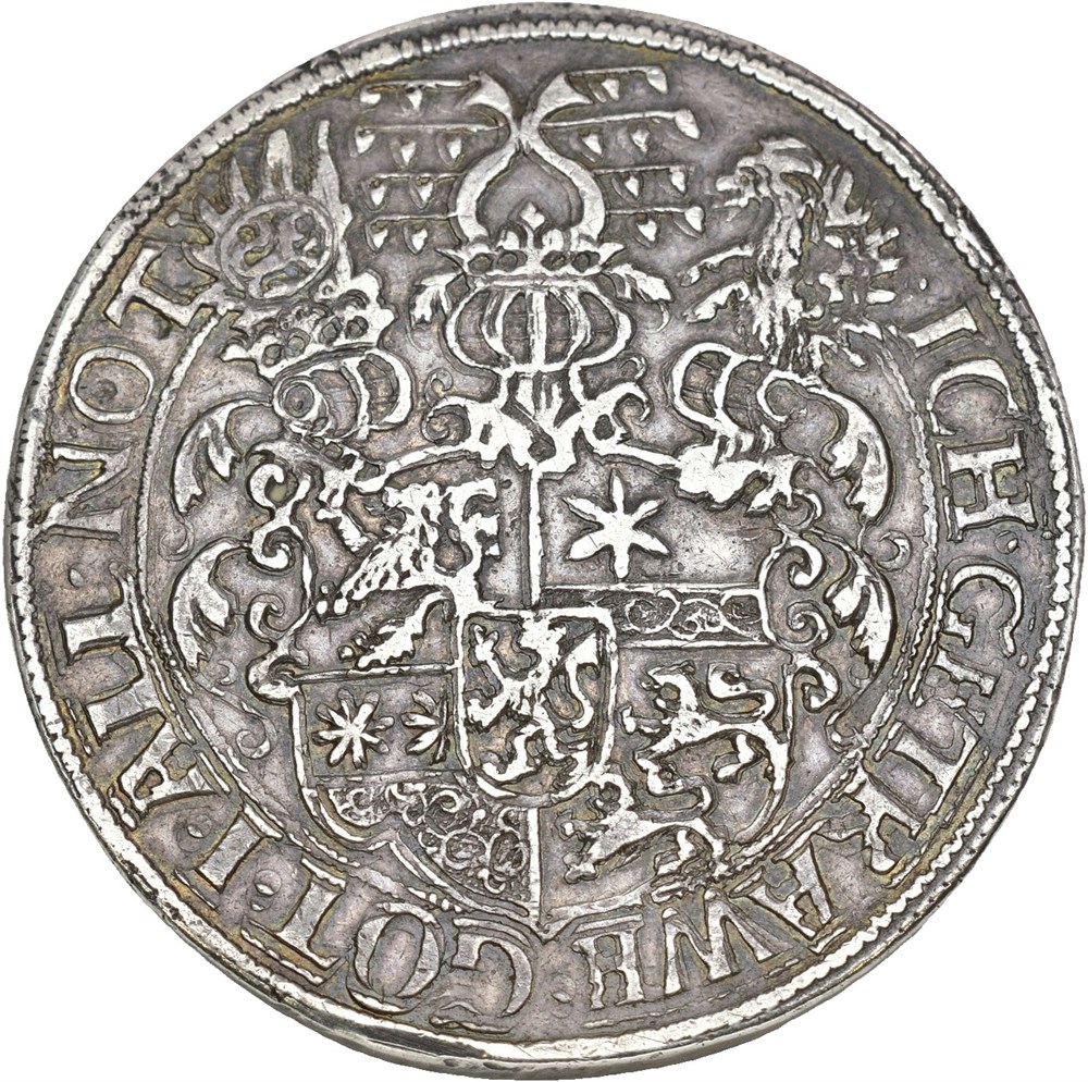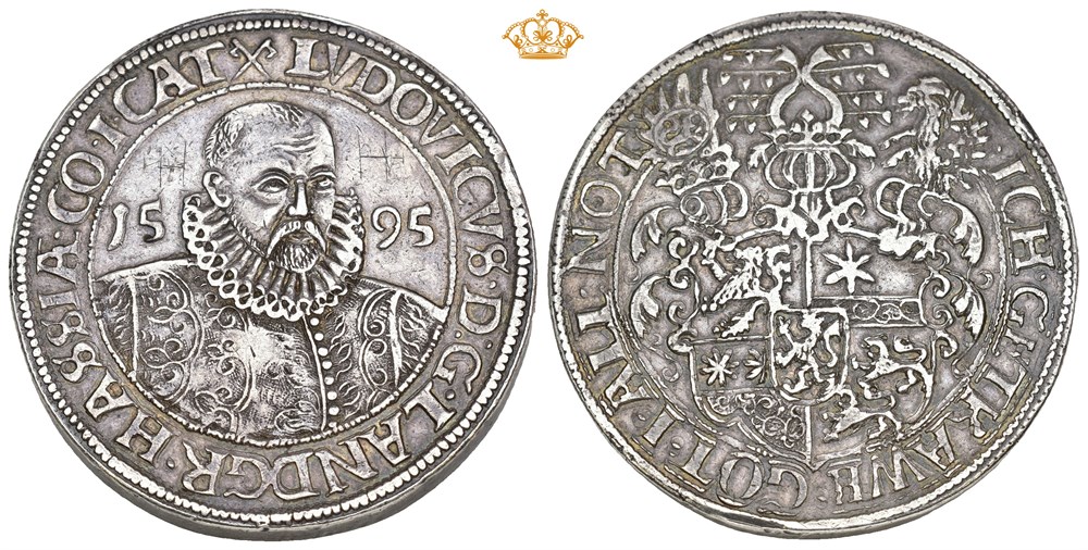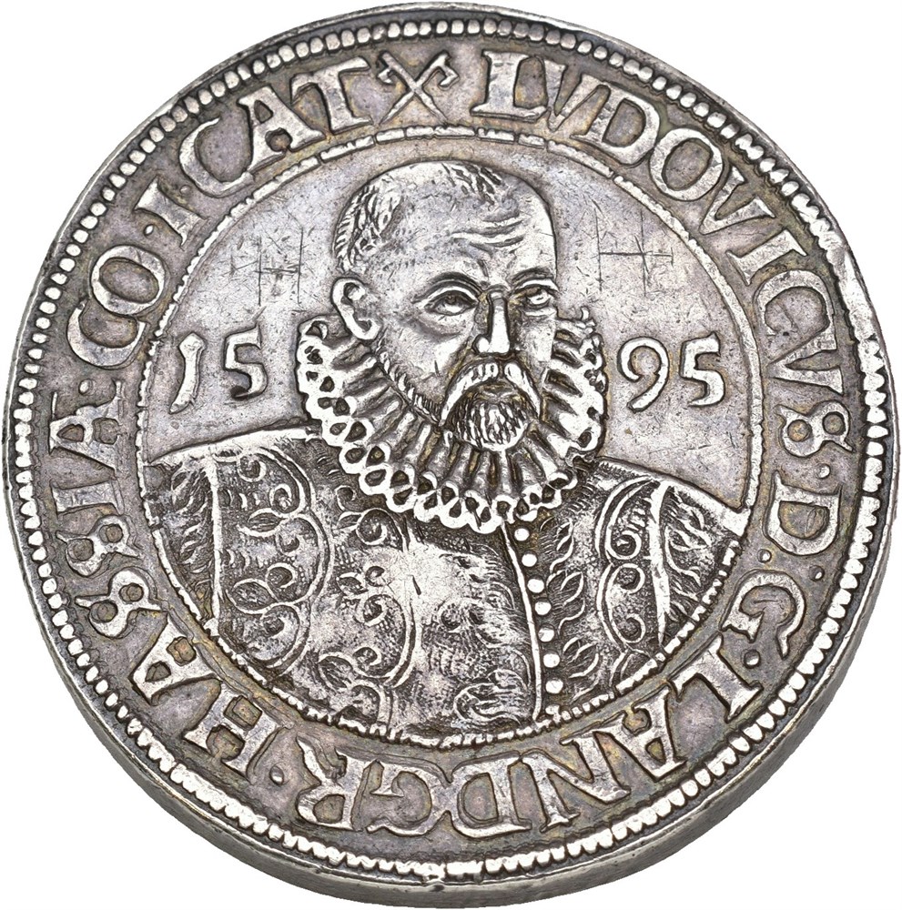 2 Taler 1595, Marburg. 59.14 g. Crossed pokers as mark for mint master Peter Arnsburg in Marburg 1593-1597. Graffiti on obverse.
