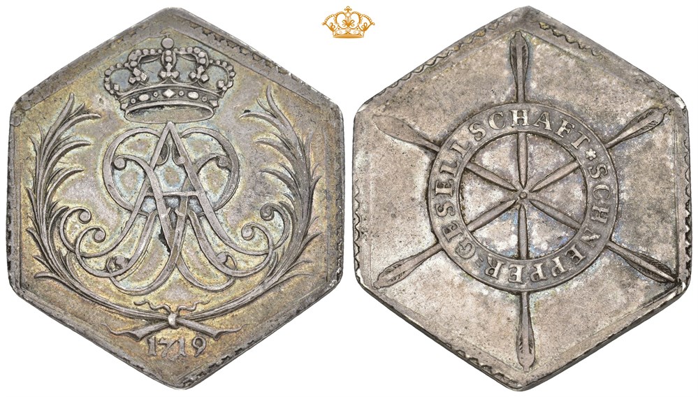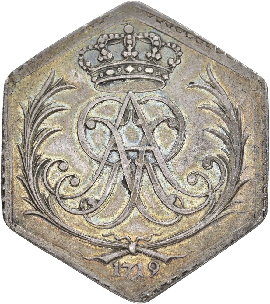 Taler 1719, Hexagon klippe, Dresden. 29.28 g. Rare. Beautiful blue-olive green iridescent patina, similar to that seen on many pieces from the Ernst Otto Horn Collection.