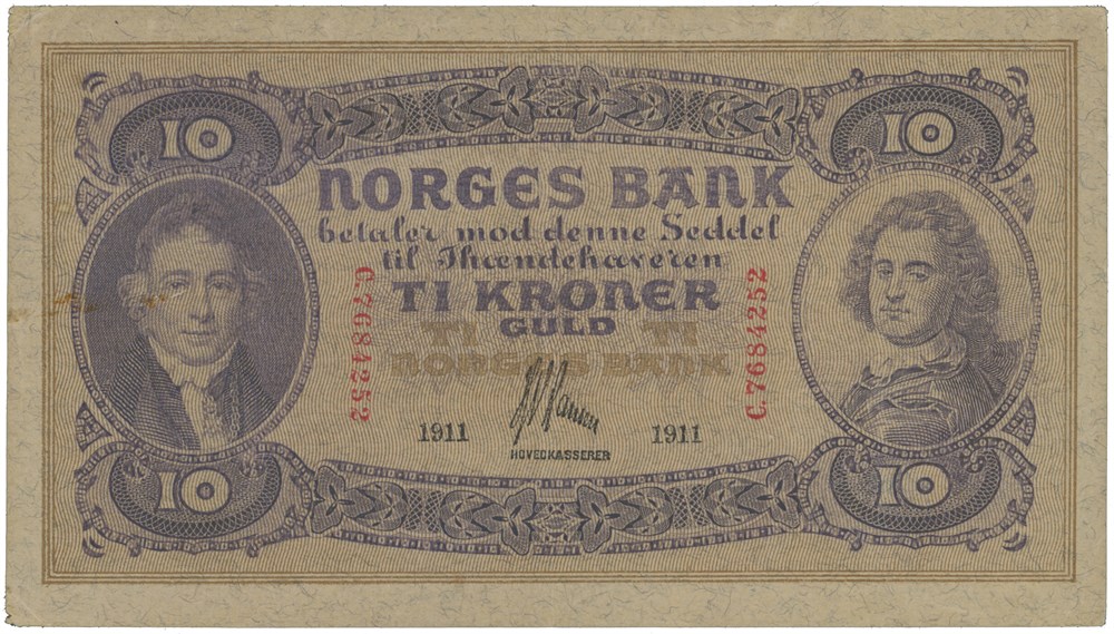 10 kroner 1911. C.7684252. Antikva seddelnummer.