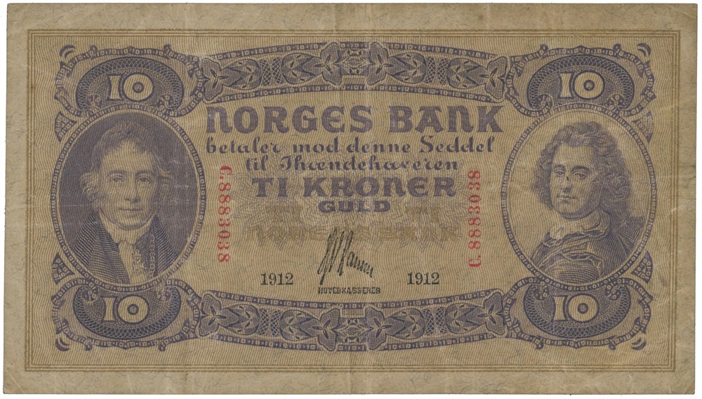 10 kroner 1912. C.8883038. Antikva seddelnummer. Sjelden/rare.