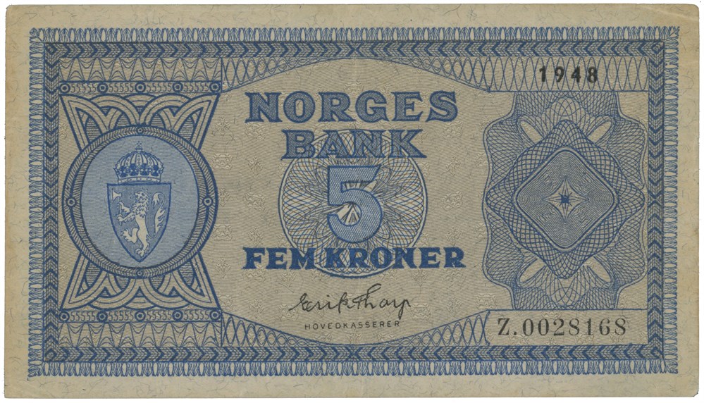 5 kroner 1948. Z.0028168. Erstatningsseddel/replacement note (0-million). Sannsynligvis unik / probably unique.