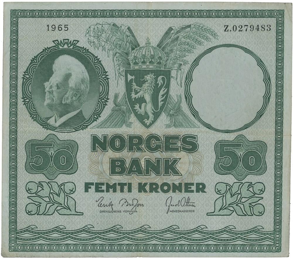 50 kroner 1965. Z.0279483. Erstatningsseddel/replacement note (0-million). Sjelden/rare.