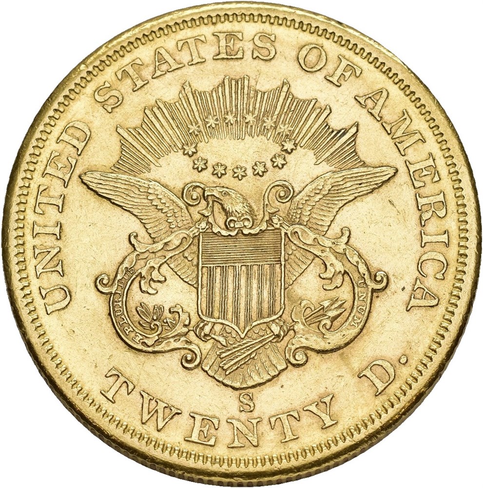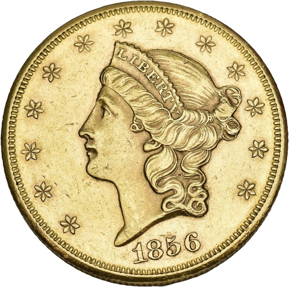 20 Dollars 1856 S, San Francisco. 33.51 g. Cleaned.
