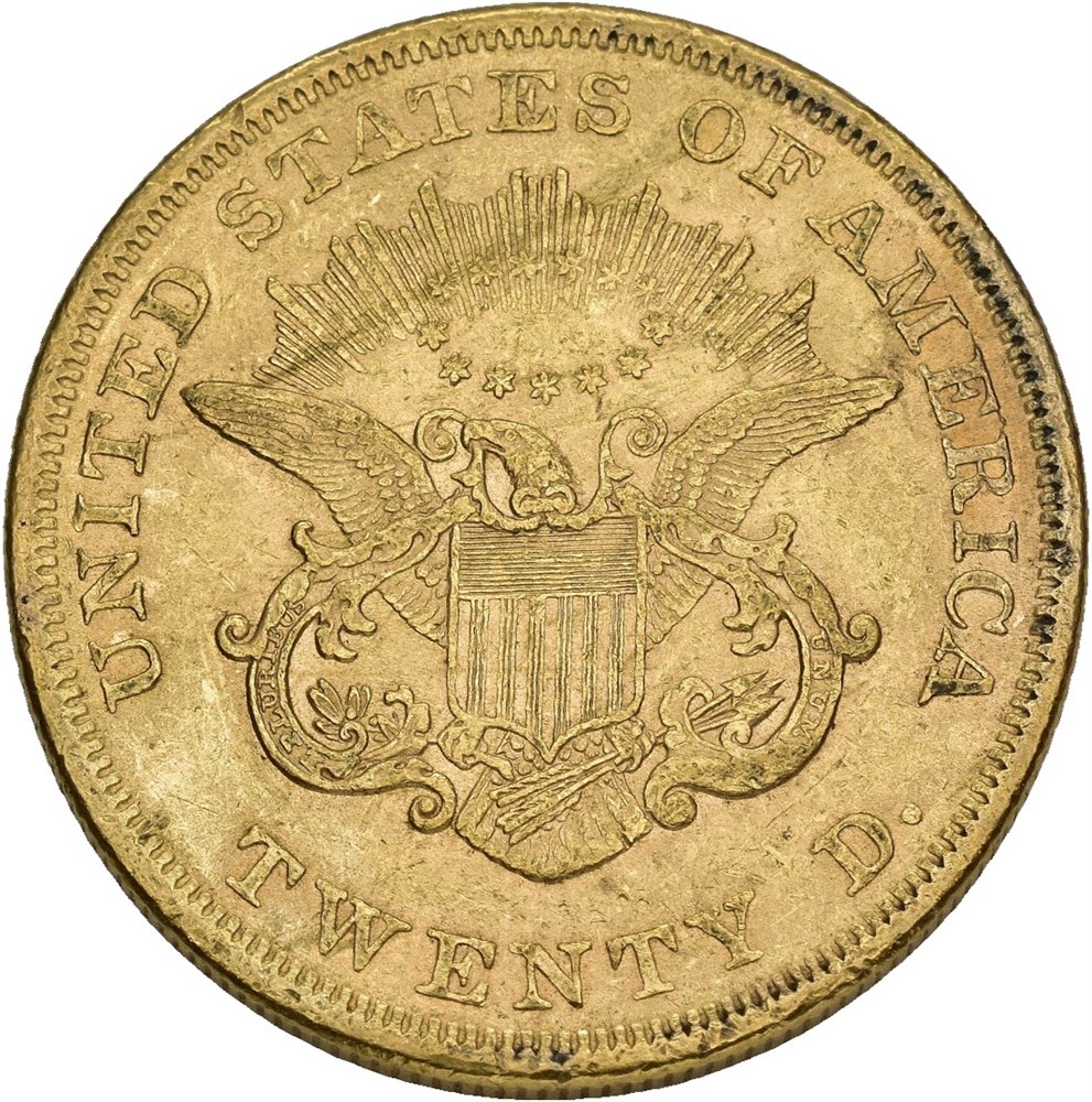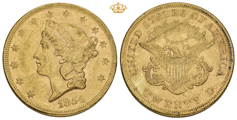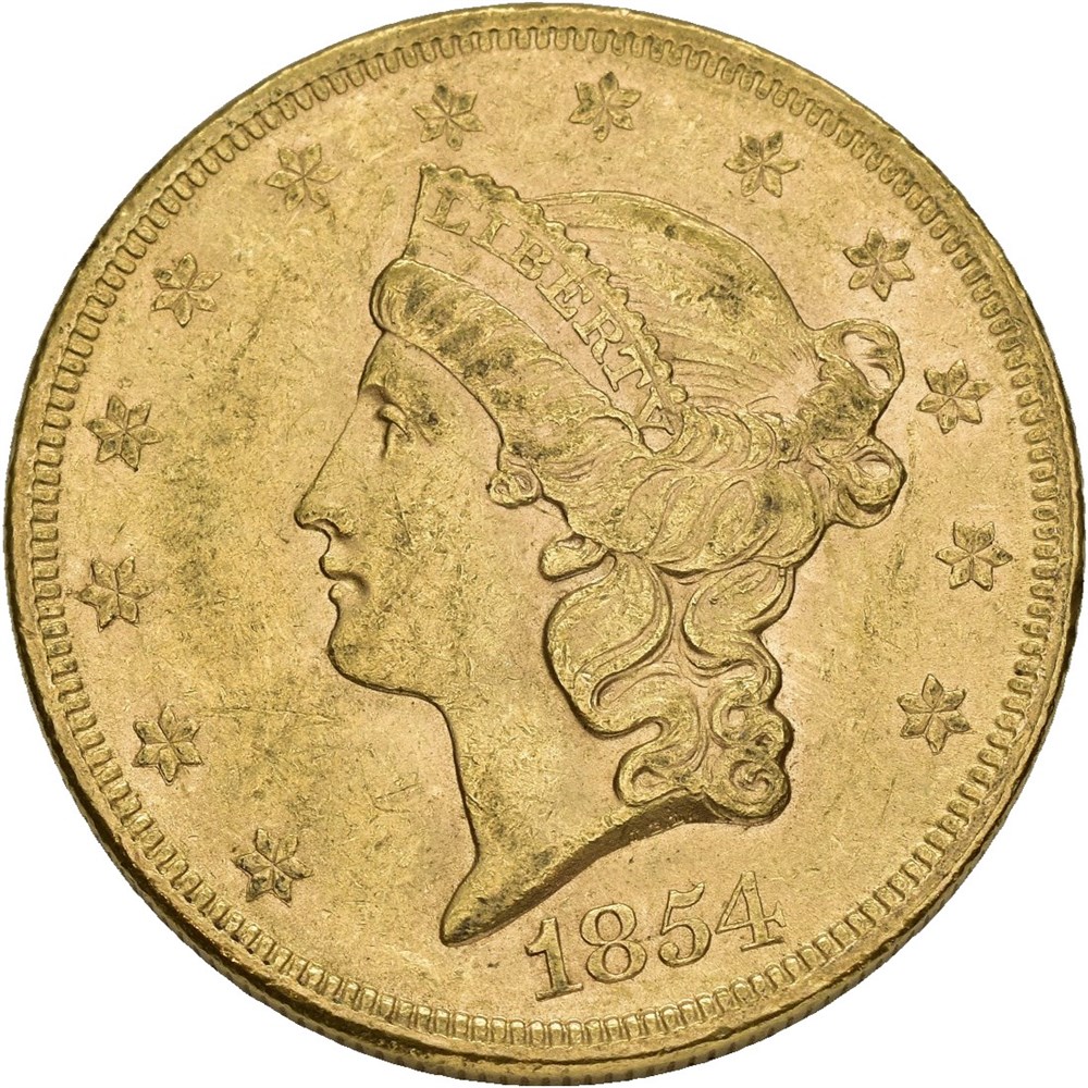 20 Dollars 1854, Philadelphia. 33.52 g. Small date variety.
