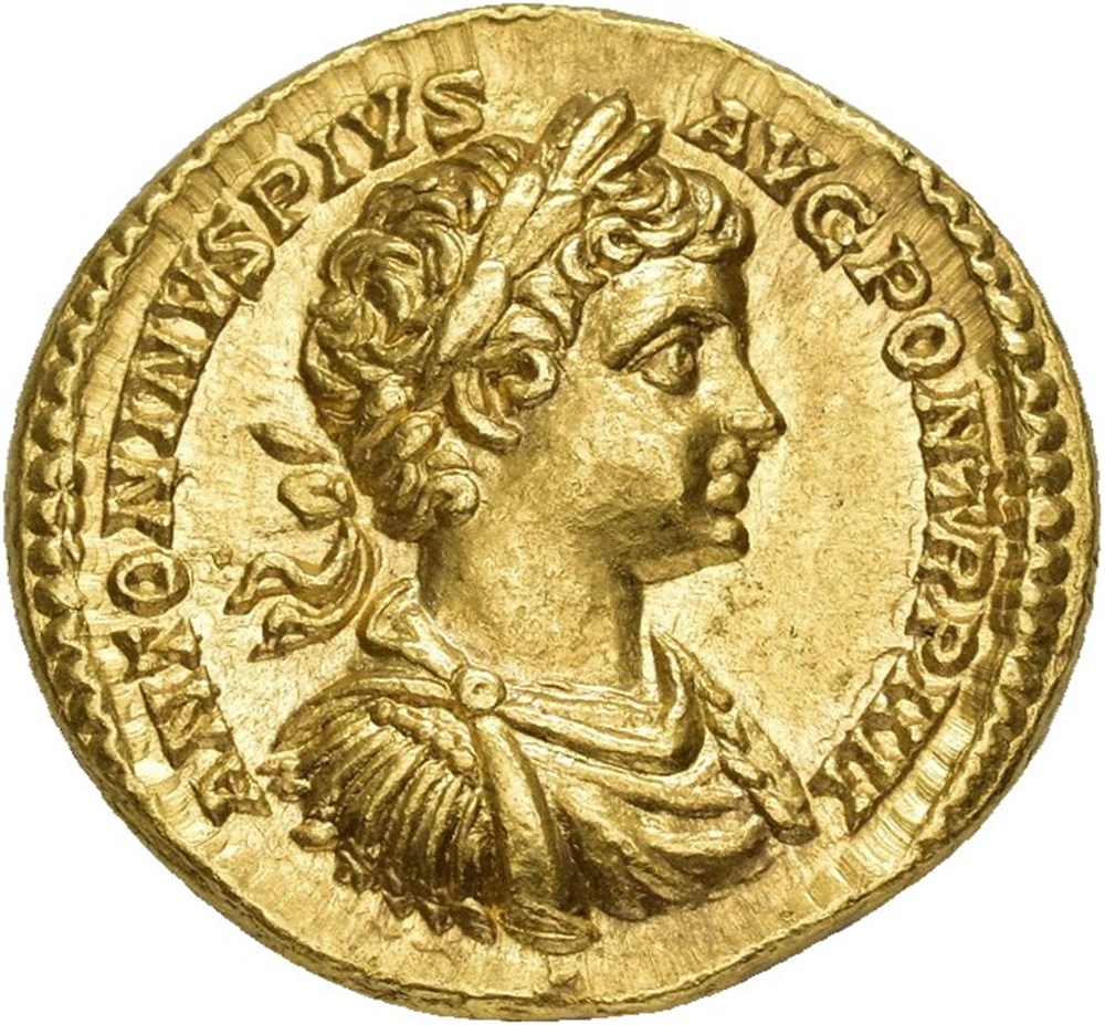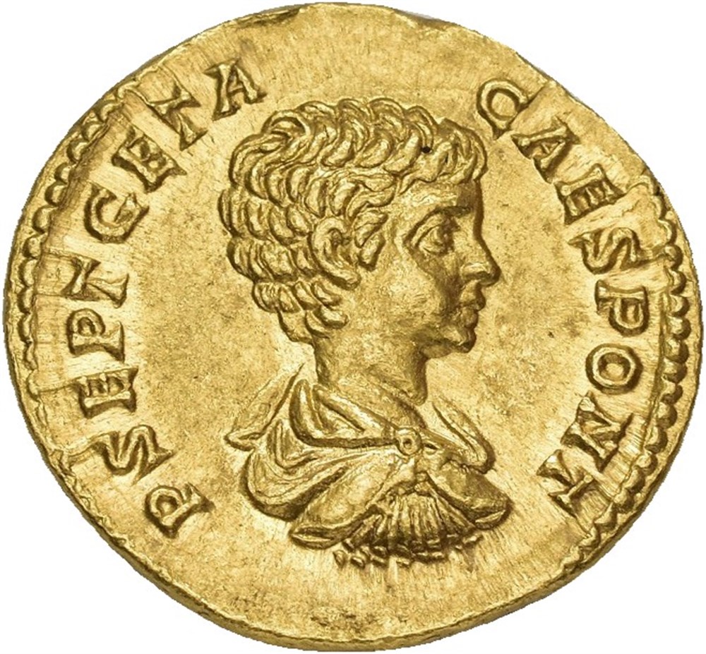 Caracalla, as Augustus, 198-217 AD, with Geta, as Caesar, 198-209 AD. AV Aureus (20 mm; 7.12 g). Rome mint, struck circa 201 AD. Obverse: ANTONINVS PIVS - AVG PON TR P IIII, Laureate, draped and cuirassed bust right. Reverse: P SEPT GETA - CAES PONT, Draped bust right. A sharply struck specimen with two wonderful portraits. Lustrous and very attractive. Very rare.