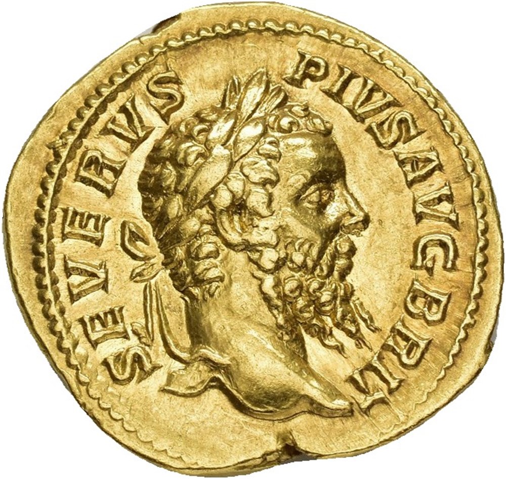 Septimius Severus 193-211 AD. AV Aureus (20 mm; 6.96 g). Rome mint, struck 210 AD. Obverse: SEVERVS PIVS AVG BRIT, Laureate bust right. Reverse: VIRTVS AVGVSTORVM, Septimius Severus, Caracalla, and Geta on horseback prancing left, each with their right hand raised. Minor edge split at 6 o'clock. Well struck and with a considerable amount of luster in fields. Very rare.
