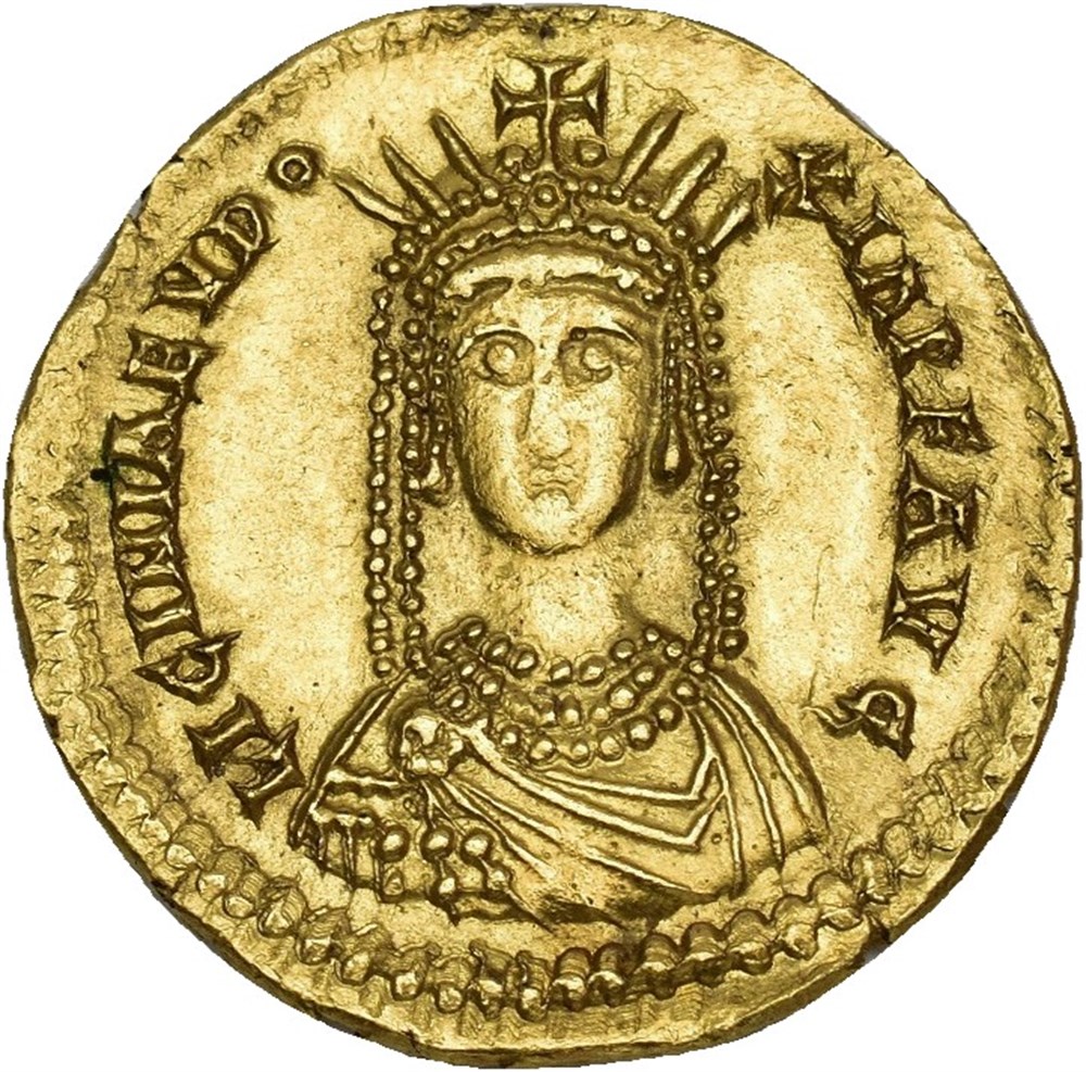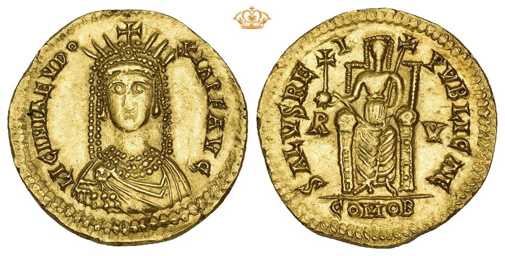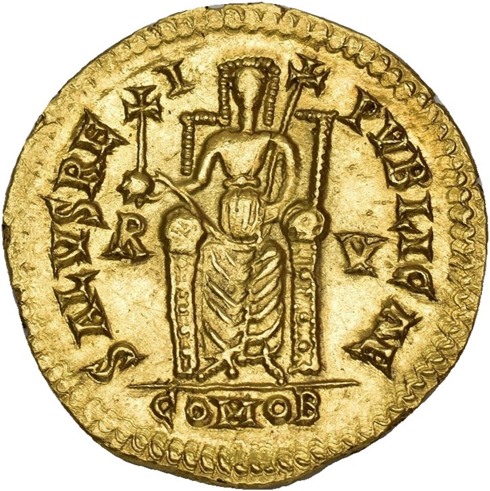 Licinia Eudoxia, Augusta circa 439-490 AD. AV Solidus (22 mm; 4.45 g). Commemorative issue. Ravenna mint, struck circa 439-445 AD. Obverse: LICINIA EVDO XIA P F AVG, Facing draped bust of Eudoxia wearing radiate crown and pearl diadem. Reverse: SALVS REI PVBLICAE, Empress enthroned facing, holding globus cruciger in right hand and long cruciform scepter with left; R-V//COMOB. Well struck on a broad flan. Minor wear on the highest points, otherwise, with sharp details and lustrous fields. Extremely rare.