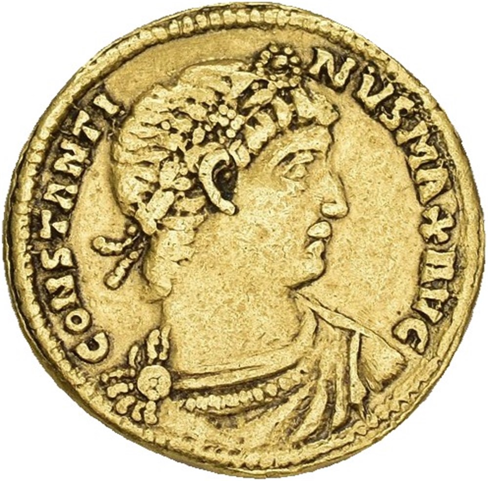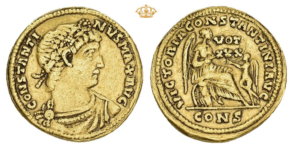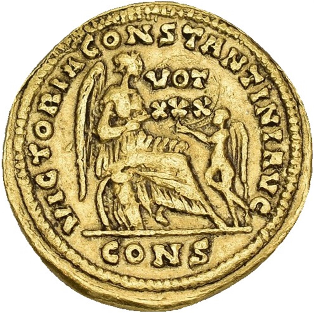 Constantine I, 307-337 AD. AV 1 1/2 Scripulum (15.5 mm; 2.25 g). Constantinople mint, struck 336 AD. Obverse: CONSTANTINVS MAX AVG, Rosette-diademed, draped and cuirassed bust right. Reverse: VICTORIA CONSTANTINI AVG, Victory seated right on cuirass, holding shield inscribed VOT/XXX; small figure of Genius helping to support shield; CONS in exergue. Slightly wavy flan and a few deposits, otherwise, a clear and attractive specimen. Extremely rare.