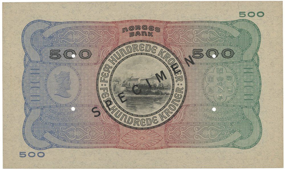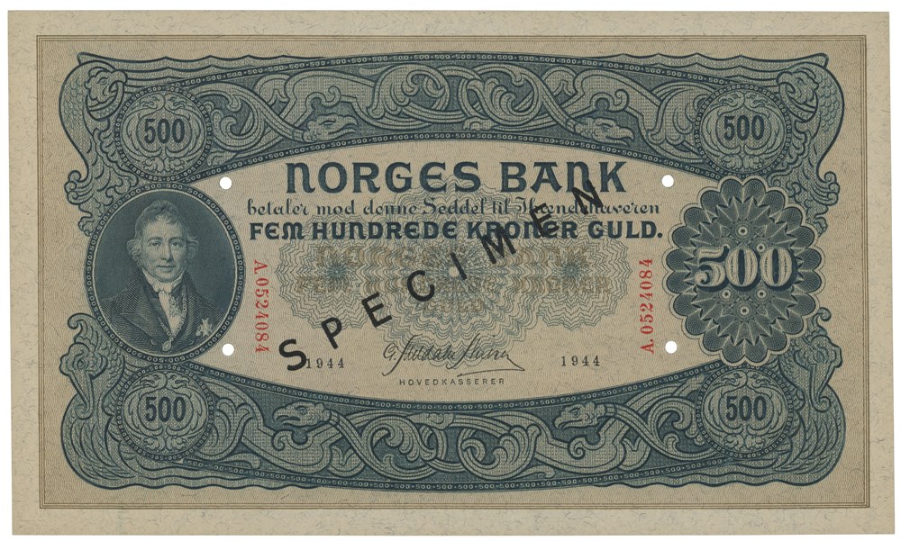 500 kroner 1944. A.0524084. Overtrykt SPECIMEN.