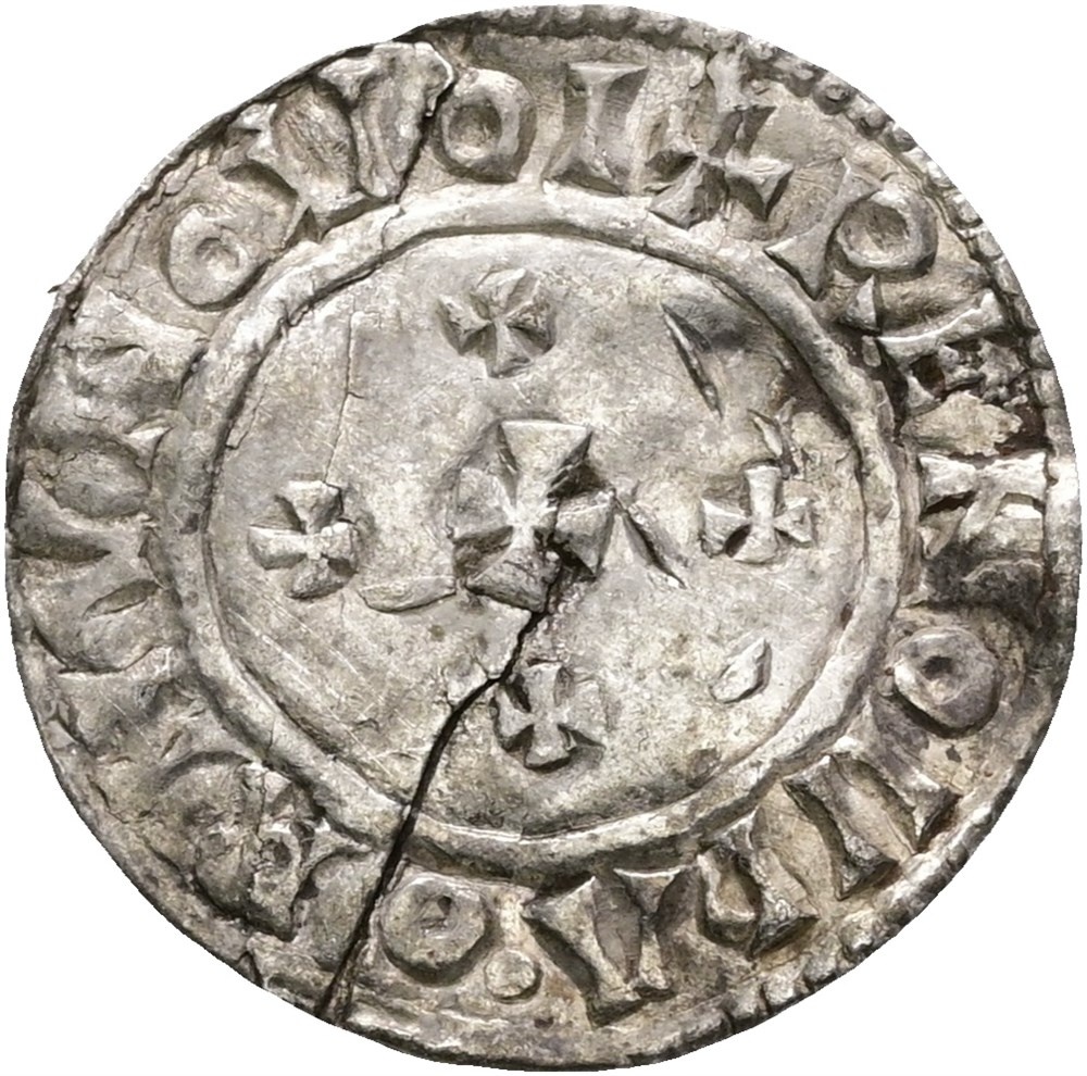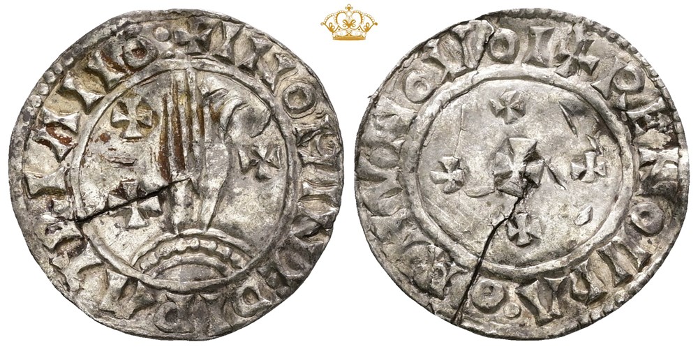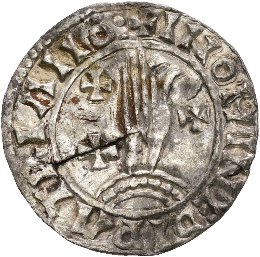 Penning, Slagelse. 0,95 g. Buklet, hakk, revne. Svært interessant type av største sjeldenhet.
